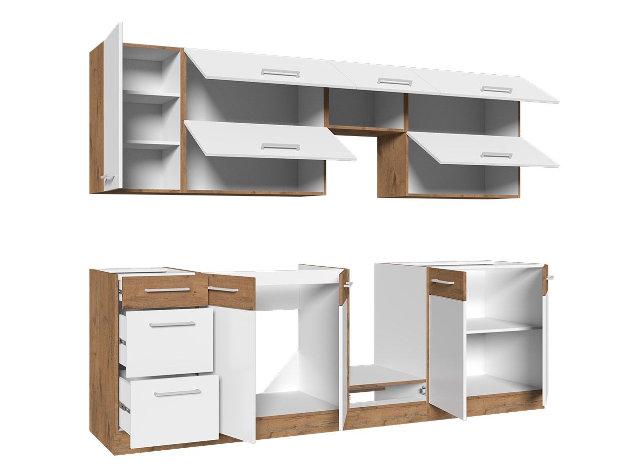 Moderní kuchyňská linka v barevném provedení korpus Dub Lancelot + dvířka Bílý lesk. Kuchyňská linka má atraktivní moderní vzhled je tak ideální volbou pro Vaši kuchyni. Dvířka kuchyňských skříněk nebo šuplíků mají tiché zavírání dvířek. U skříněk s výklopem se dvířka zvedají pomocí plynových pístů. V ceně kuchyňské linky jsou plastové úchyty, které je možnost za příplatek nahradit kovovými. U šuplíků velikosti 60 a 80 cm jsou boky šuplíků kovové.