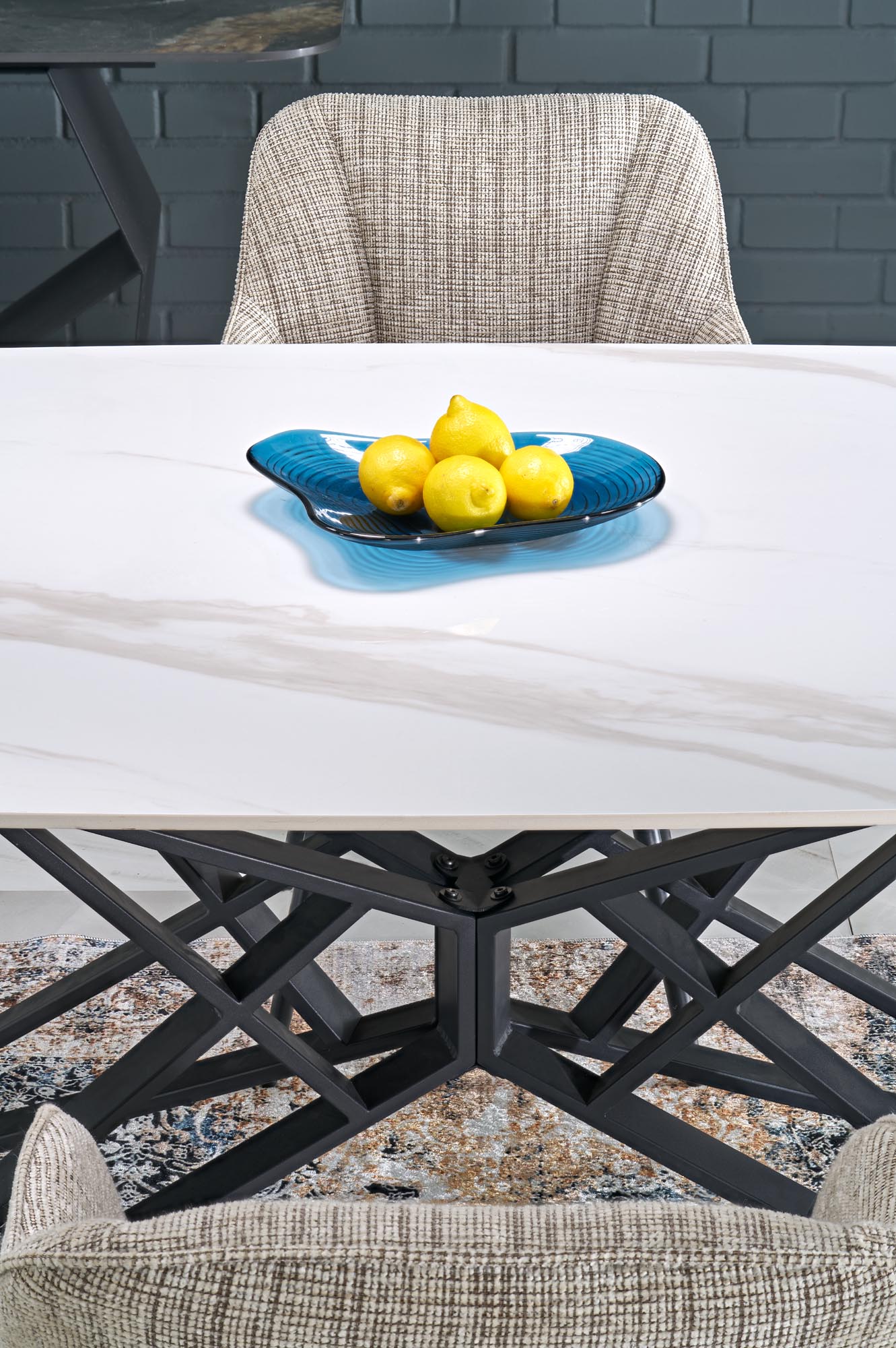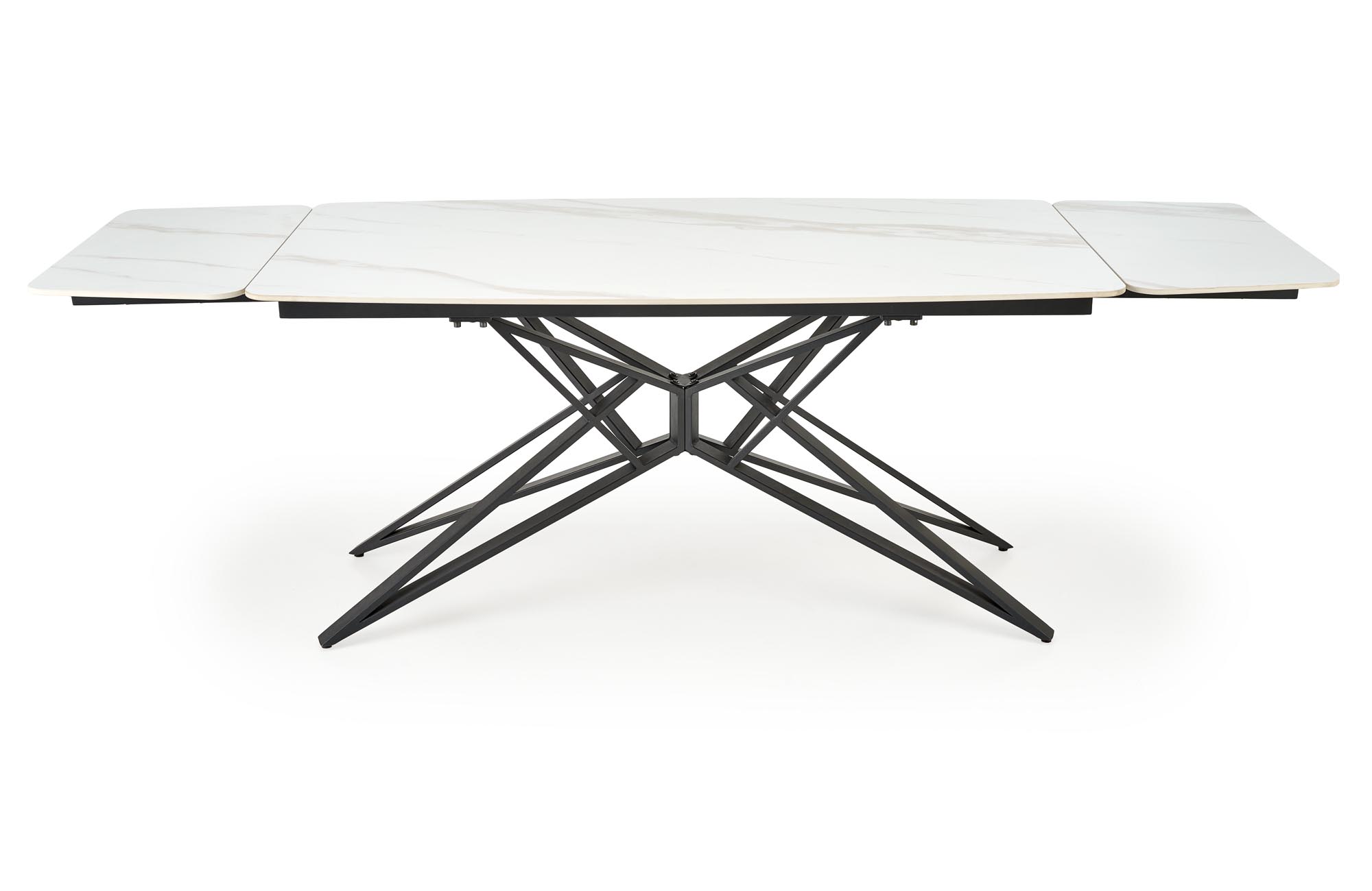 Jídelní stůl ALFREDO - je robustní rozkládací stůl vyroben ze slinutého kamene v barvě bílého mramoru s moderní podnoží z černě lakované práškové oceli.