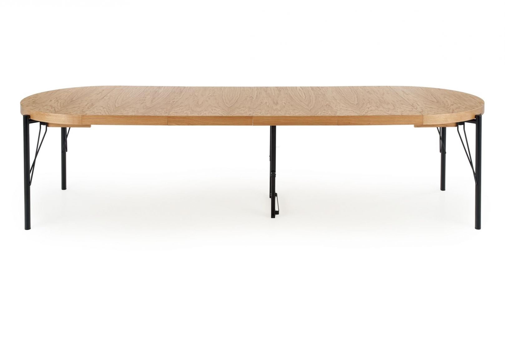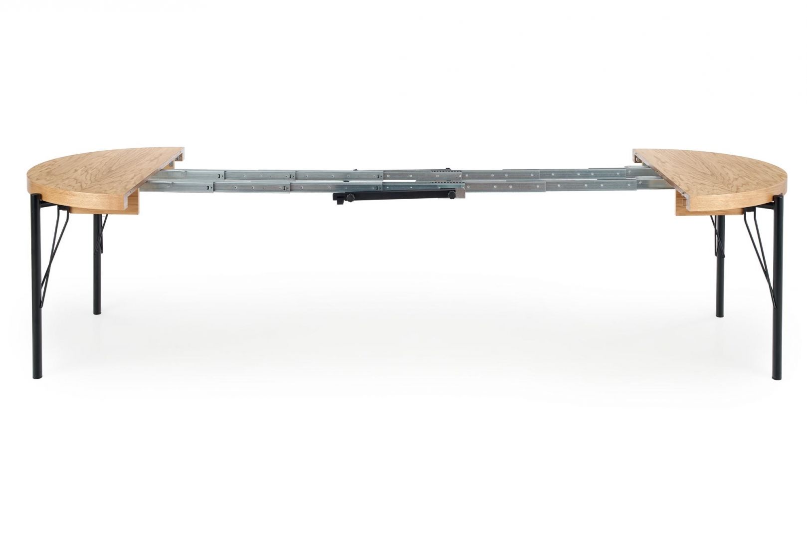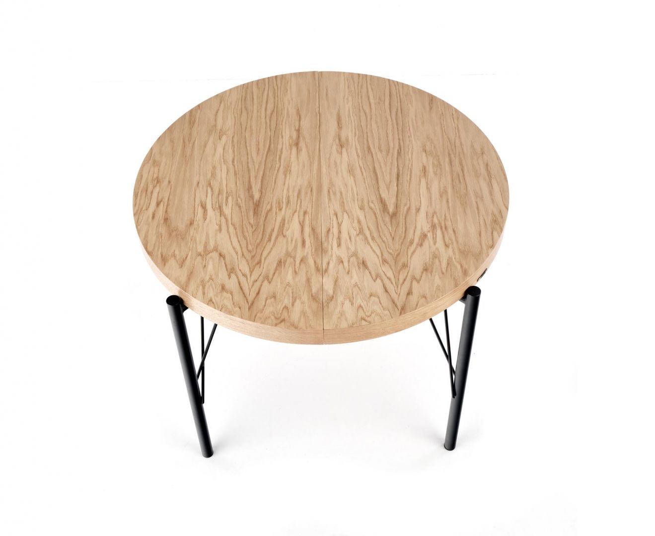 Jídelní stůl INFERNO - je kulatý rozkládací stůl vyrobený z vysoce kvalitní MDF desky potažené přírodní dýhou v barevném dekoru dub přírodní. Stabilní podnož je vyrobena z černé lakované oceli.