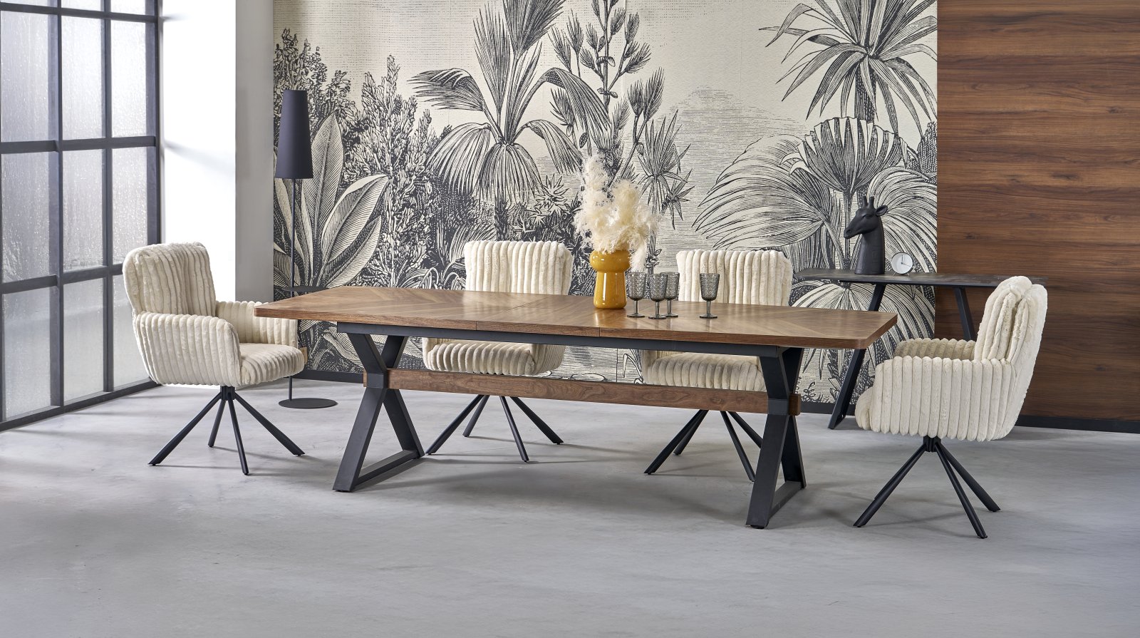 Jídelna je důležitým bodem domova, ve kterém se setkává celá rodina a přátelé, stojí za to věnovat se výběru vhodného stolu a investovat do něj. Kromě toho, že se jedná především o praktický kus nábytku, moderní jídelní stůl určuje celkový styl interiéru. Moderní a čistý design mu dává elegantní a sofistikovaný vzhled. Tento stůl je ideální do jídelny ale také do zasedacích místností. Jídelní desku lze rozložit až na délku 350 cm. U jídelního stolu může pohodlně stolovat 6 až 12 osob. Jídelní stůl je vyrobený v kombinaci MDF, přírodní dýhy a práškované oceli. Užijte si krásu bydlení bez kompromisu ohledně funkce.