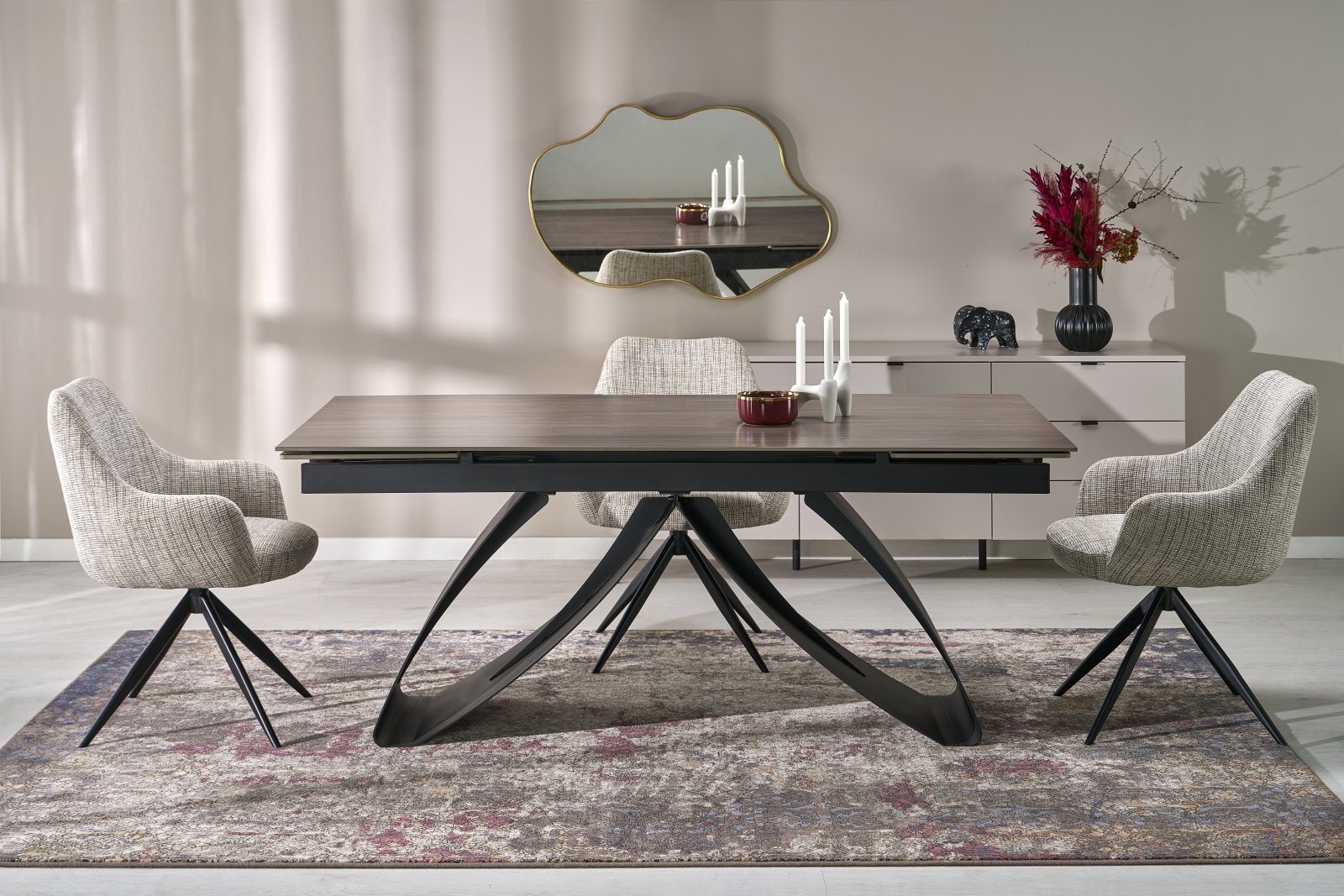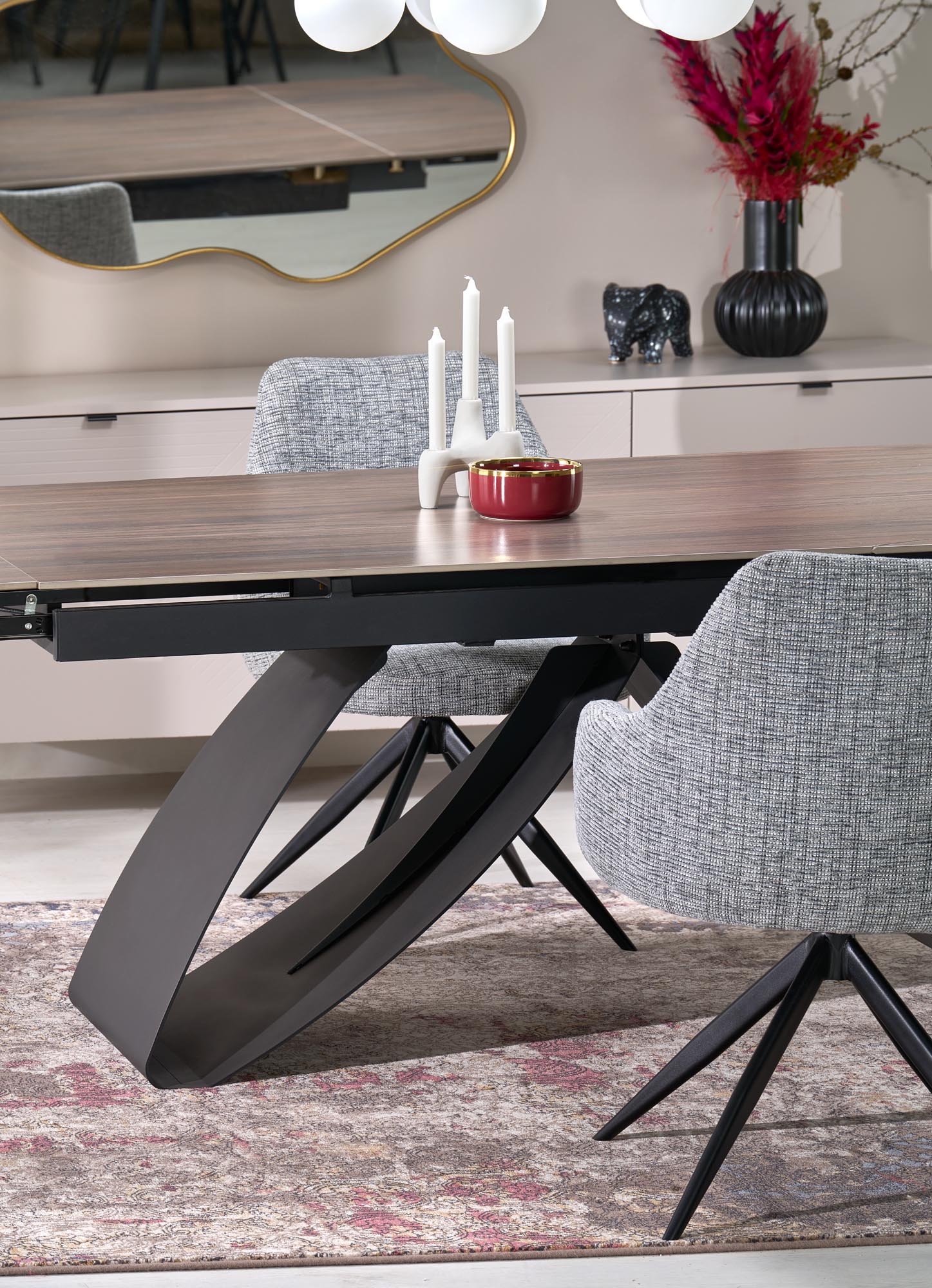 Jídelní stůl HILARIO - je robustní rozkládací stůl vyroben ze slinutého kamene v barvě ořechu s moderní podnoží z černě lakované práškové oceli.