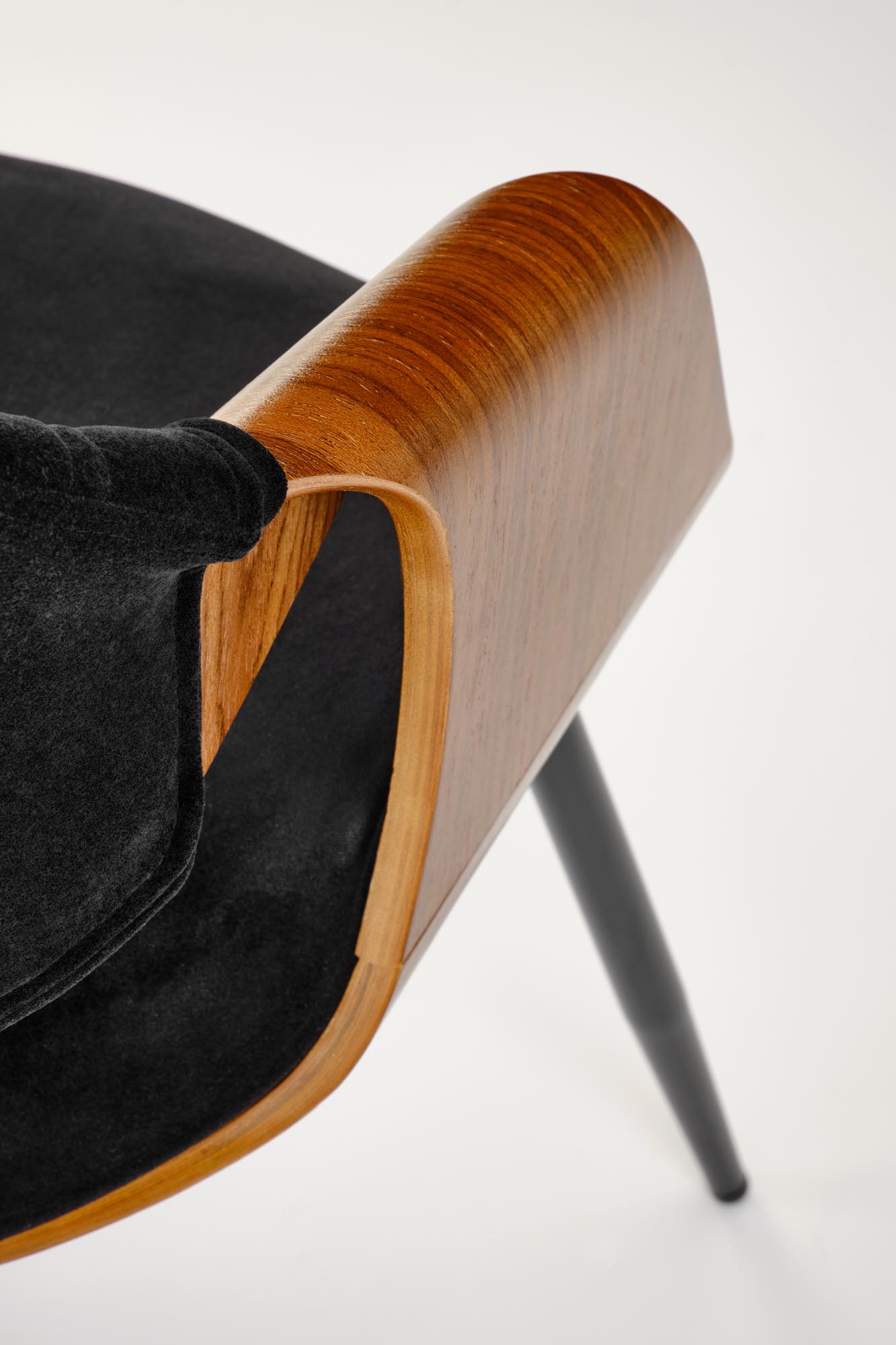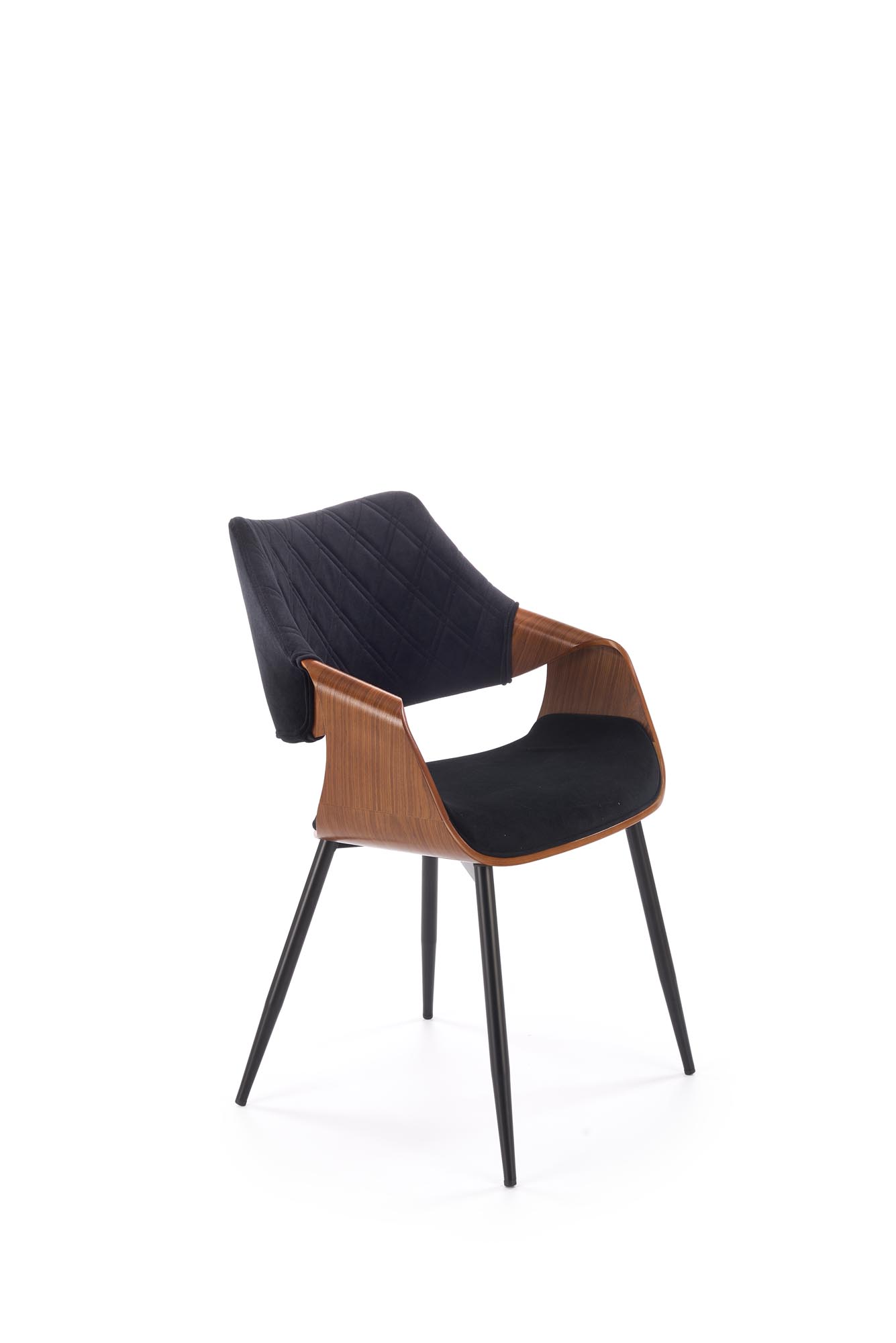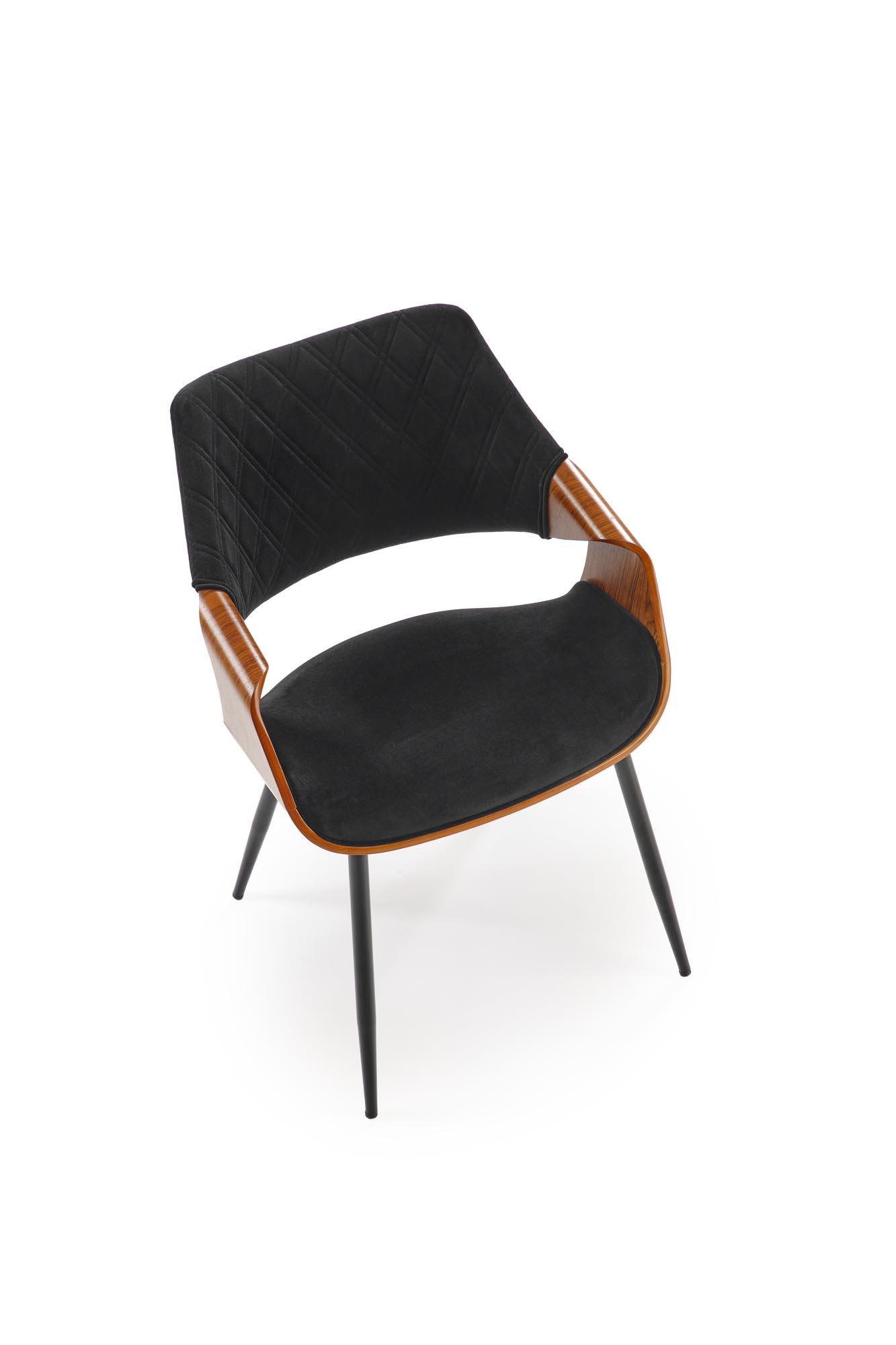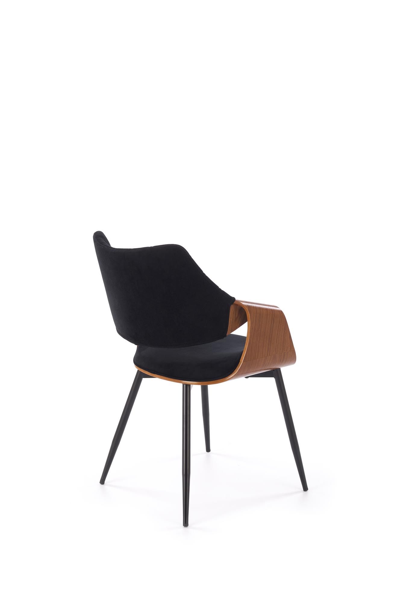 Jídelní židle K586 - je elegantní židle vyrobena v kombinaci lakované oceli v černé barvě, ohýbané překližky v odstínu ořech a na dotek sametové černé látky BLUVEL.