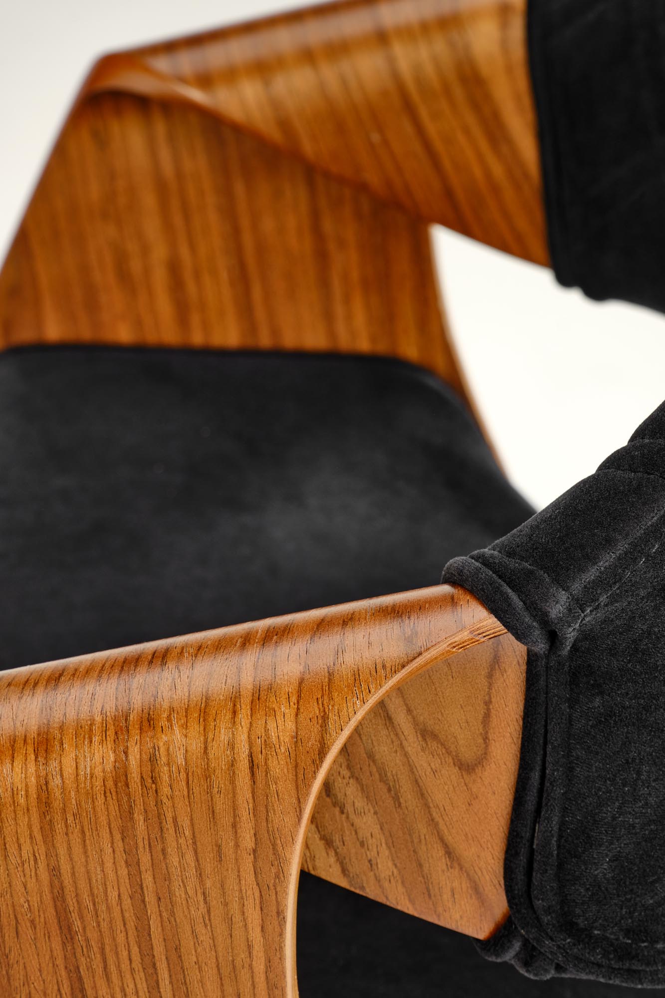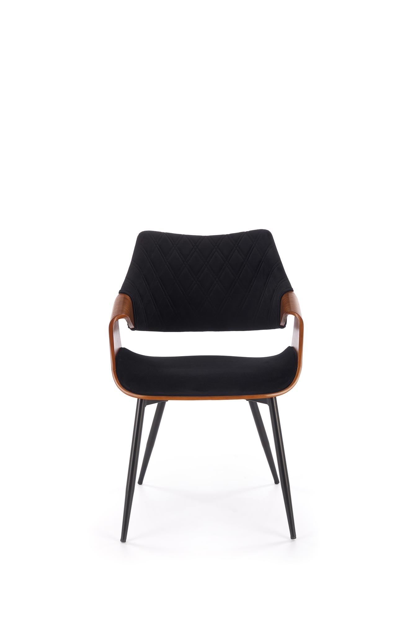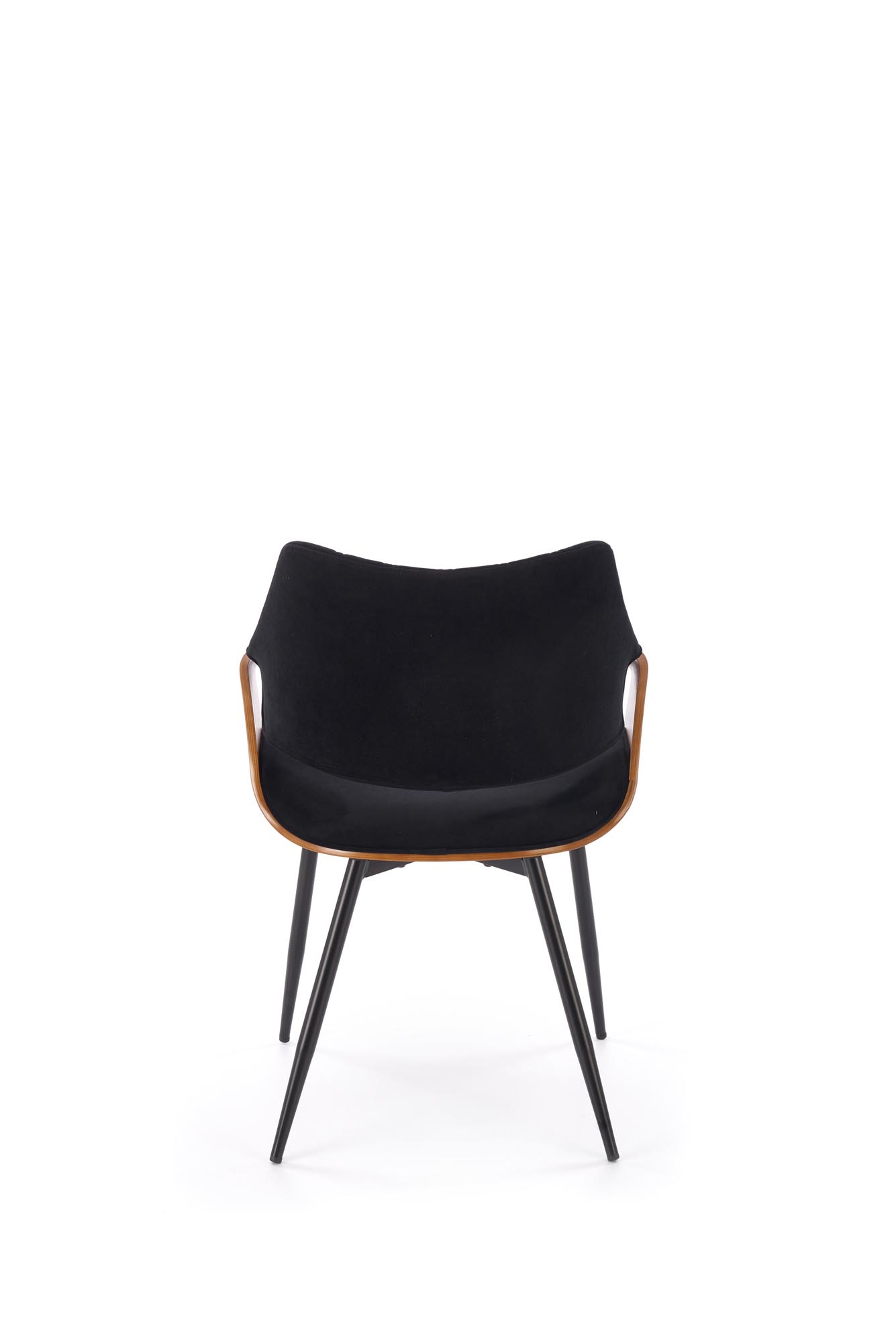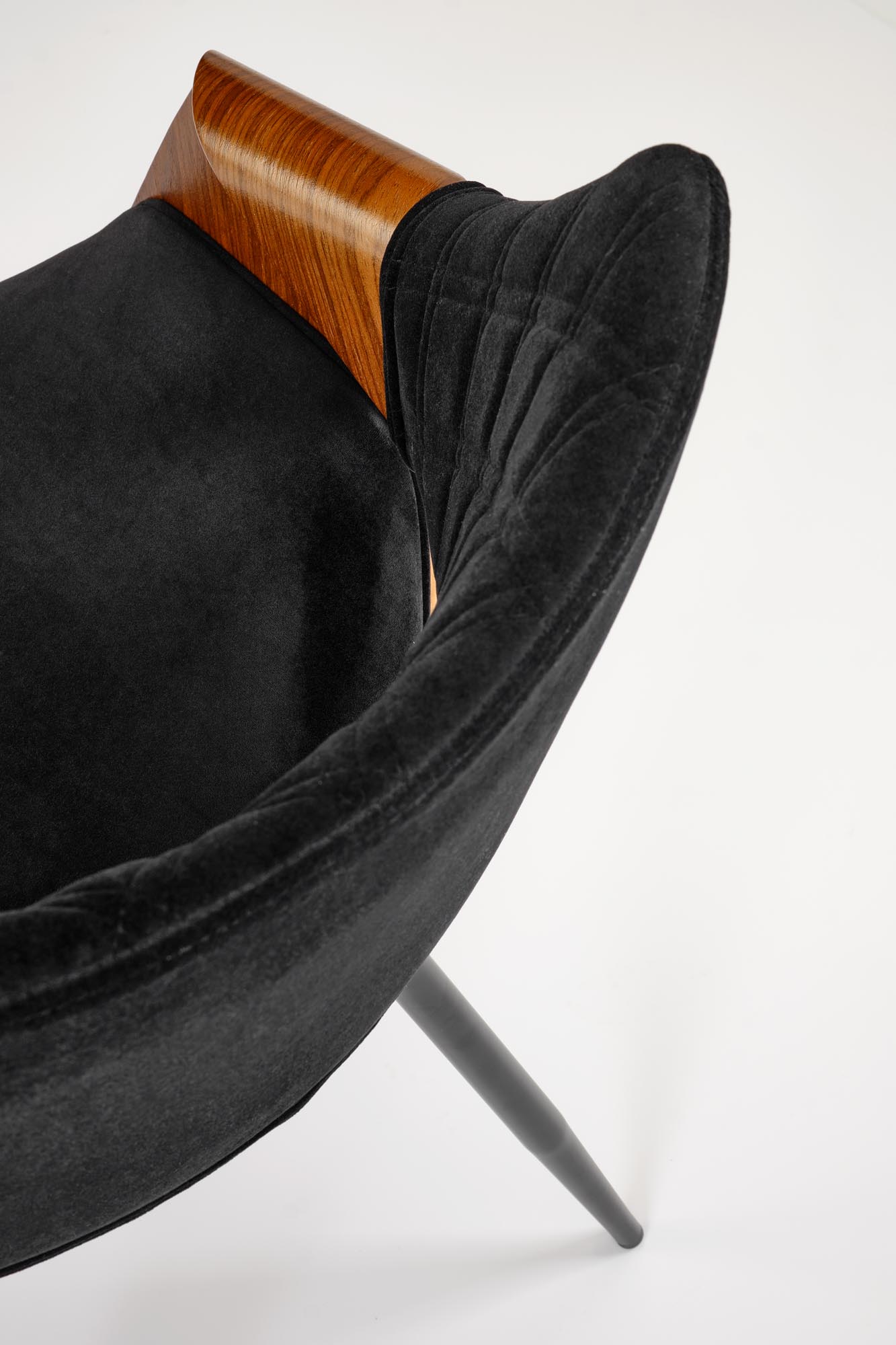 Jídelní židle K586 - je elegantní židle vyrobena v kombinaci lakované oceli v černé barvě, ohýbané překližky v odstínu ořech a na dotek sametové černé látky BLUVEL.