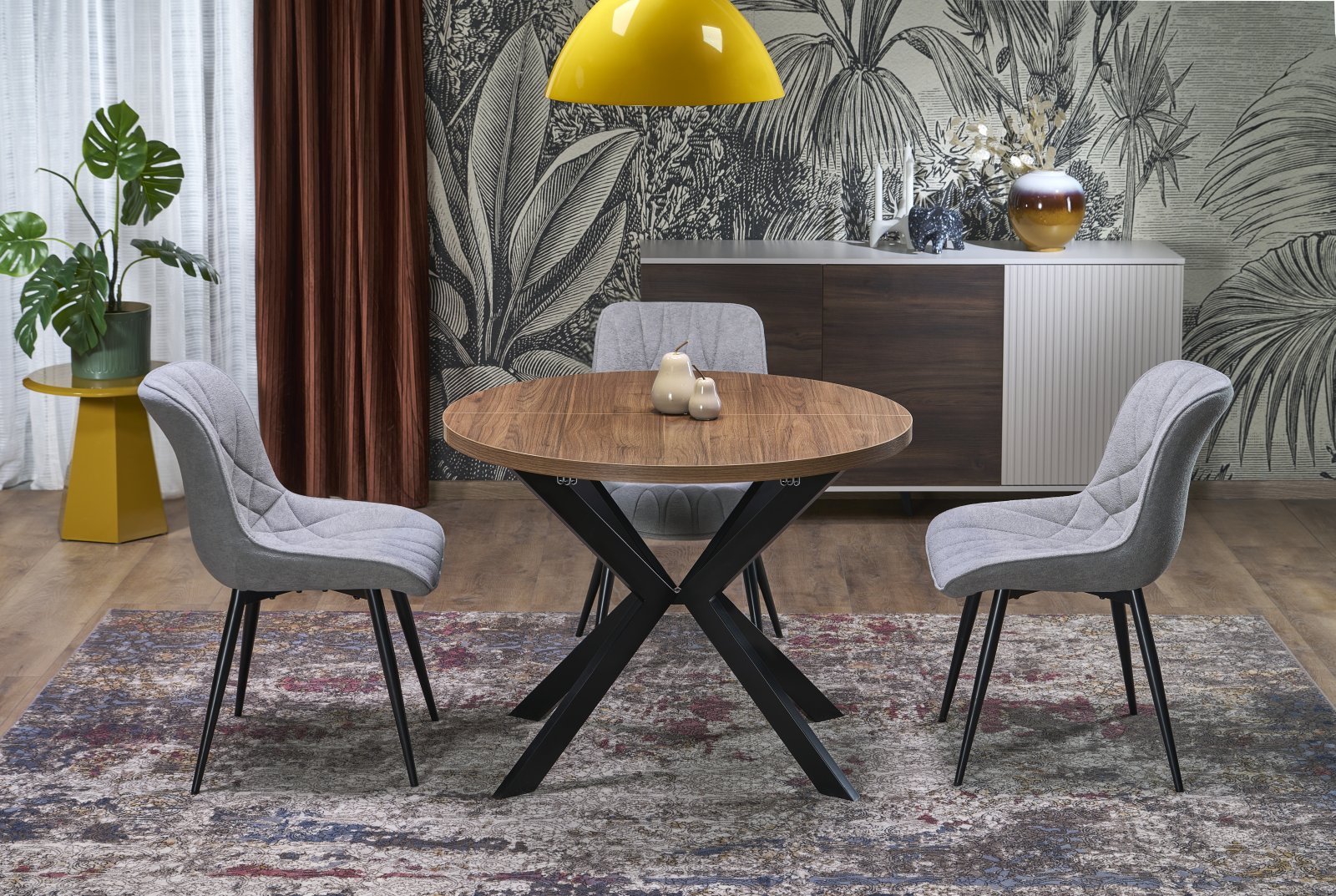 Jídelní stůl PERONI - je rozkládací kulatý moderní jídelní stůl. Deska vyrobena v dekoru ořech a nohy z práškově lakované oceli černé barvy.