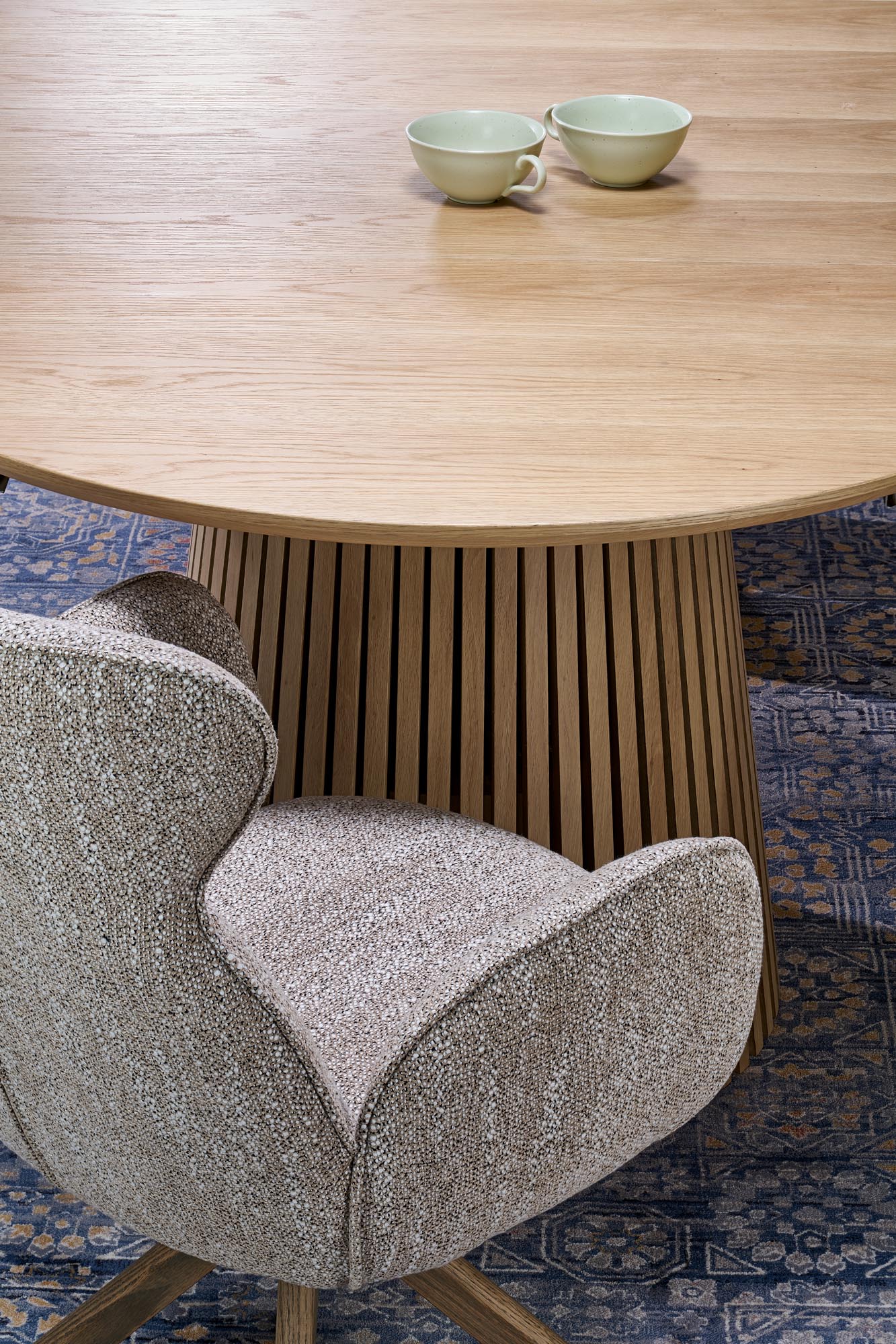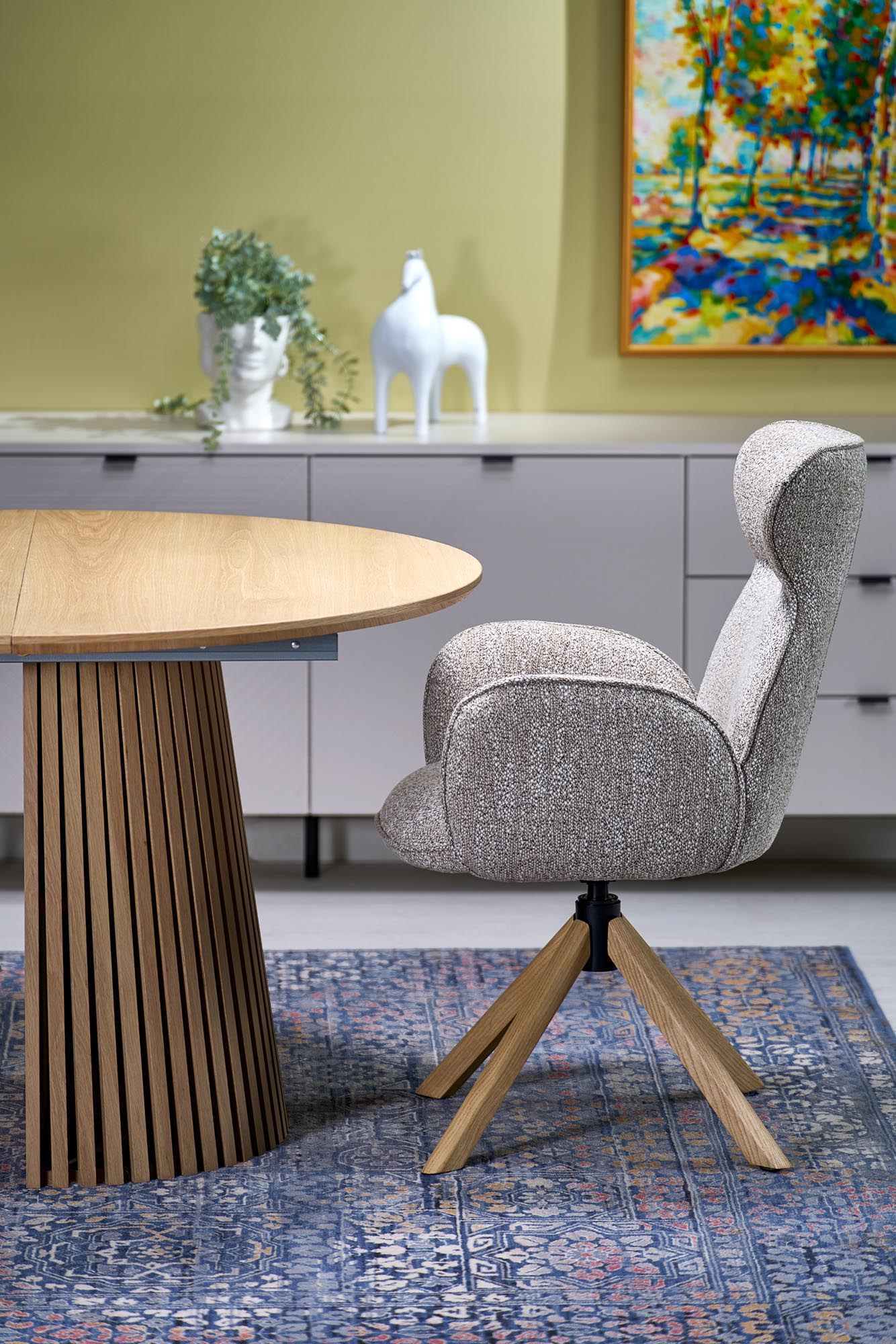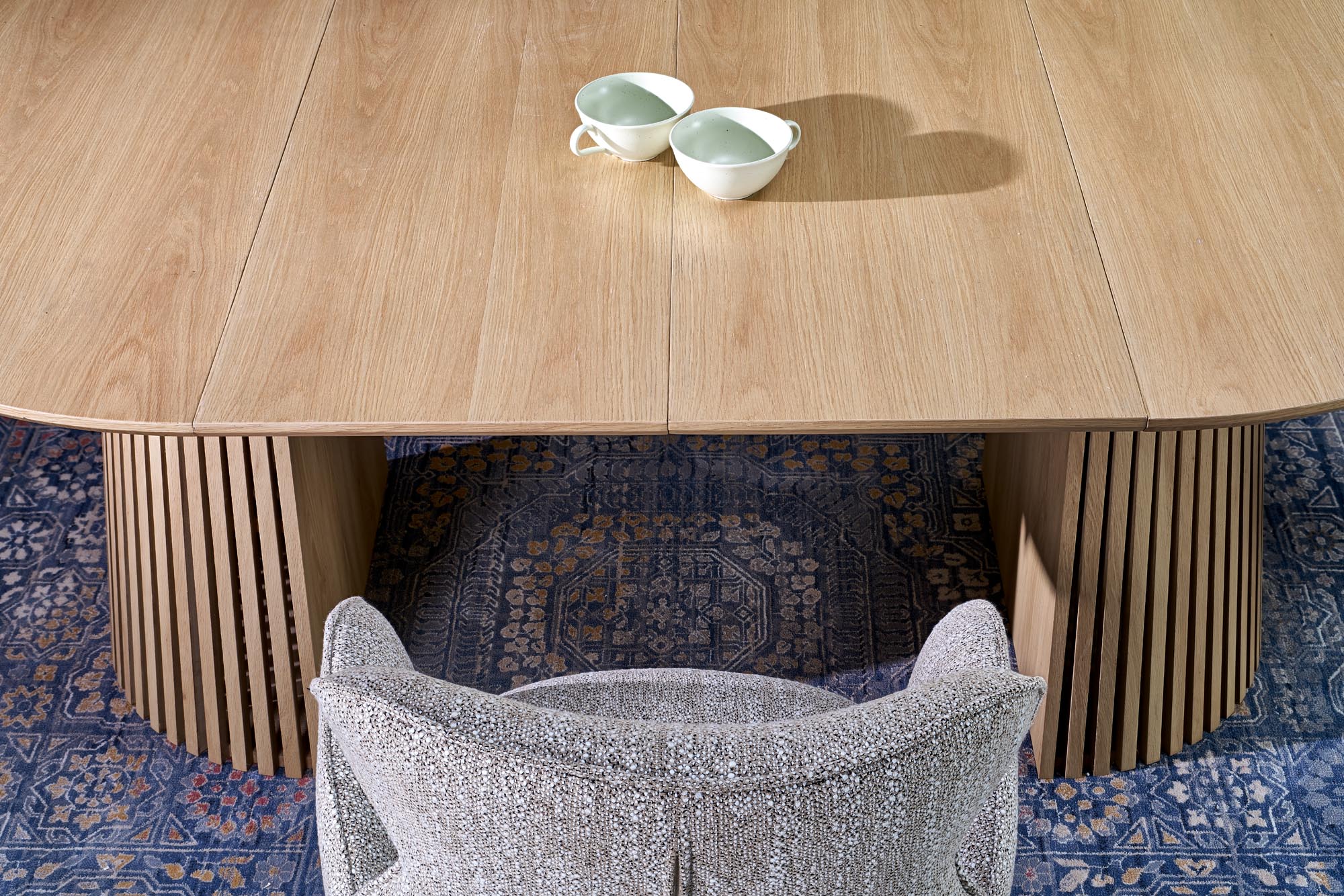 Stůl FARGO propojuje elegantní vzhled s praktickým využitím a přírodním stylem. Díky rozkládacímu mechanismu se snadno přizpůsobí běžnému stolování i větším rodinným či přátelským setkáním. Stolová deska z MDF s přírodní dýhou v teplém odstínu působí útulně a vnáší do interiéru harmonii. Stabilní nohy v ladící barvě zajišťují pevnost konstrukce a kvalitní povrchová úprava podtrhuje sofistikovaný charakter tohoto stolu.