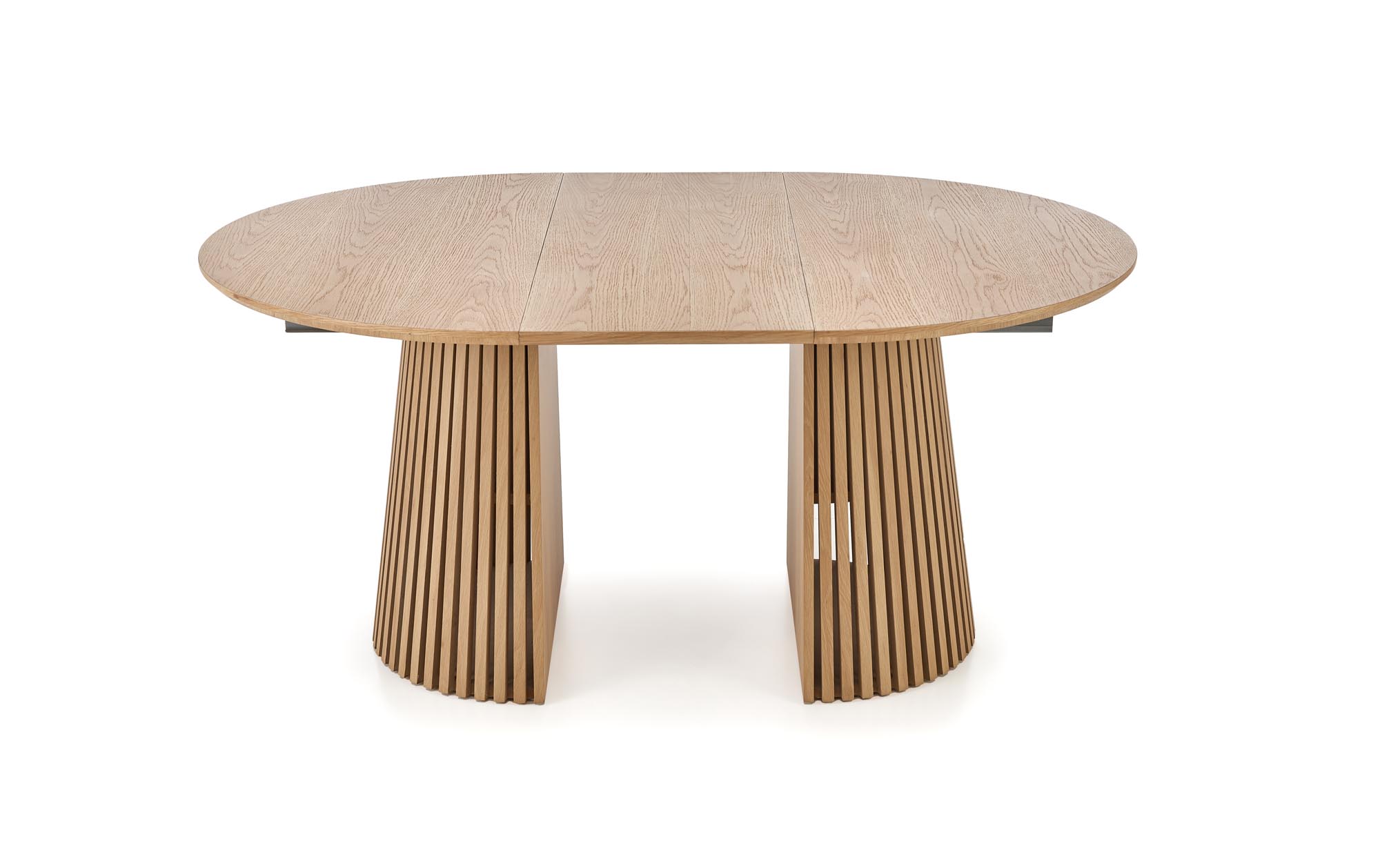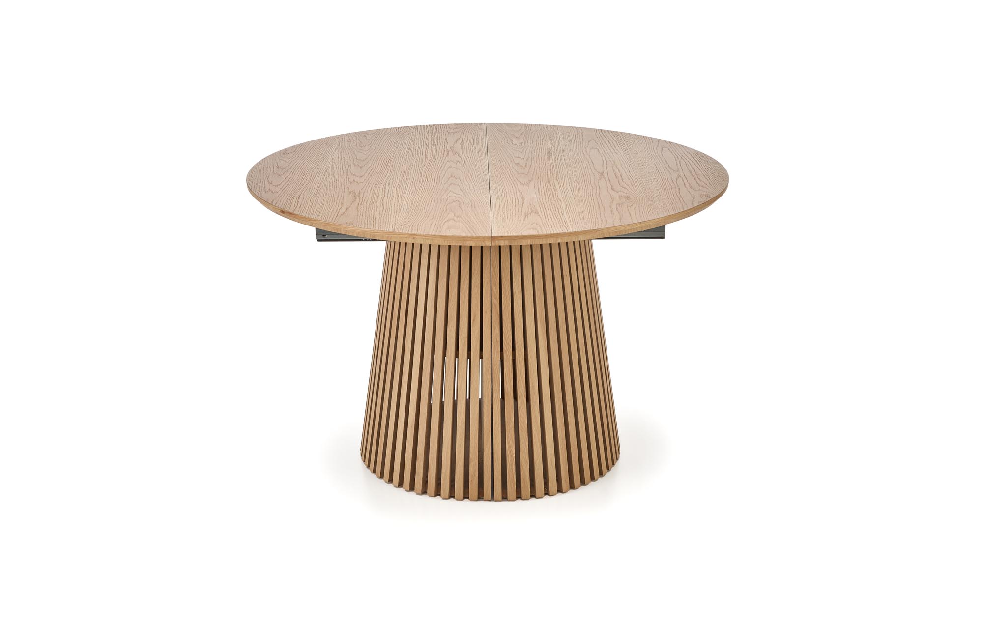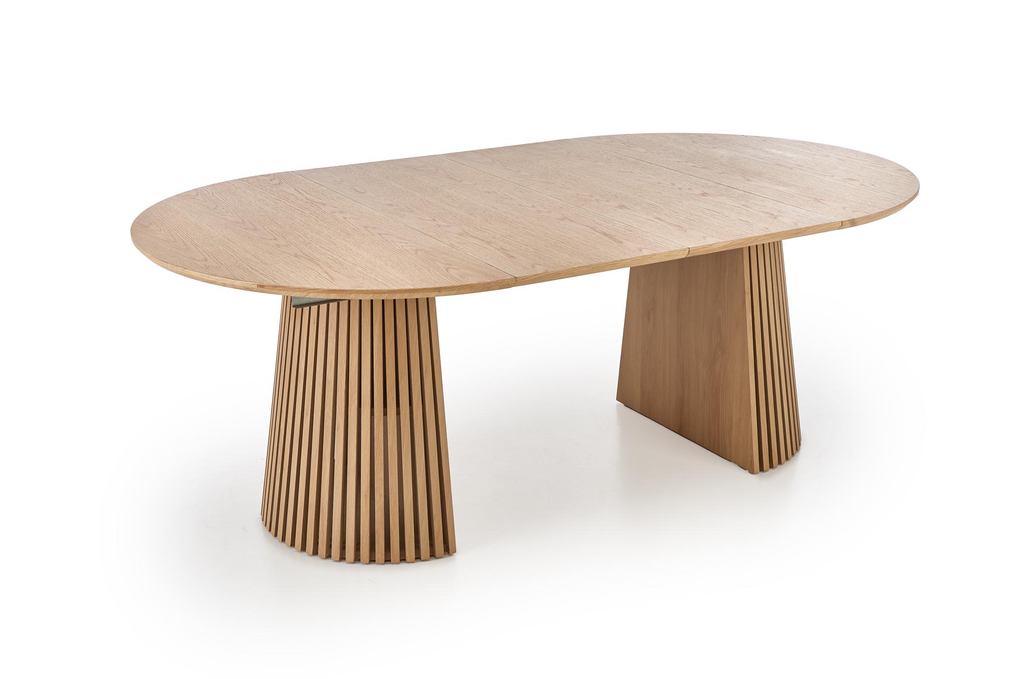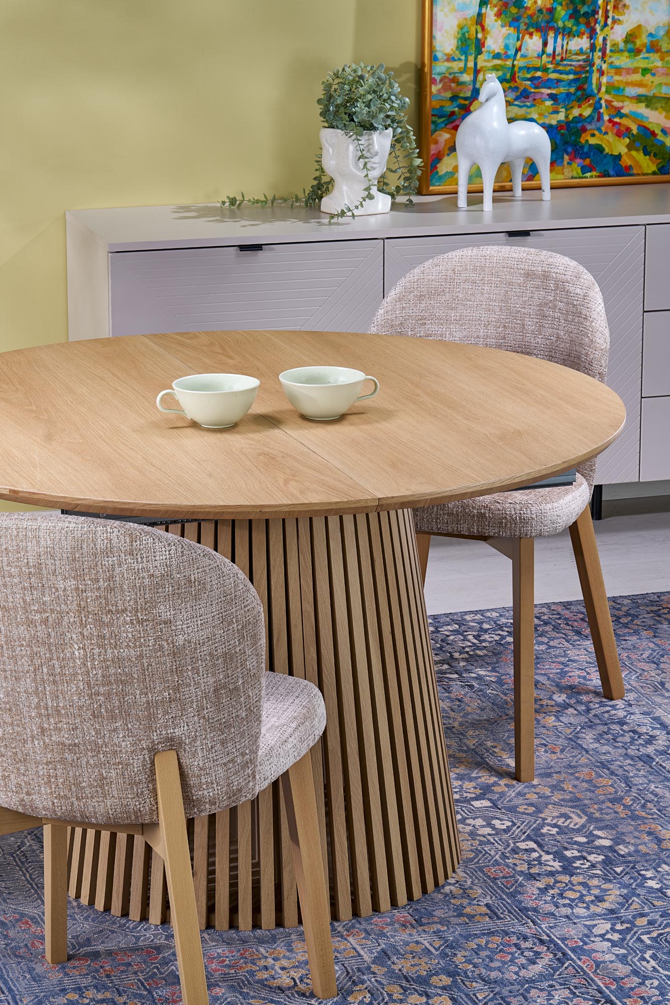 Jídelní stůl FARGO - rozkládací jídelní stůl s deskou z MDF v přírodní dýze a pevnými nohami v teplém odstínu, spojující eleganci, praktičnost a přírodní design.