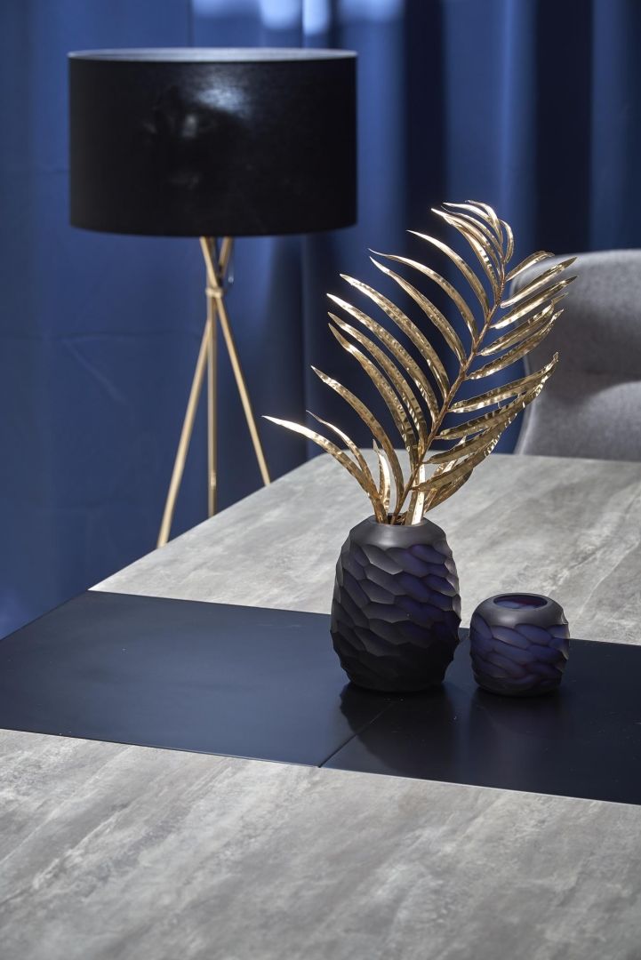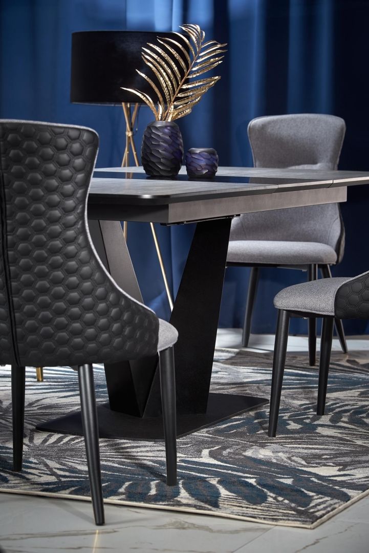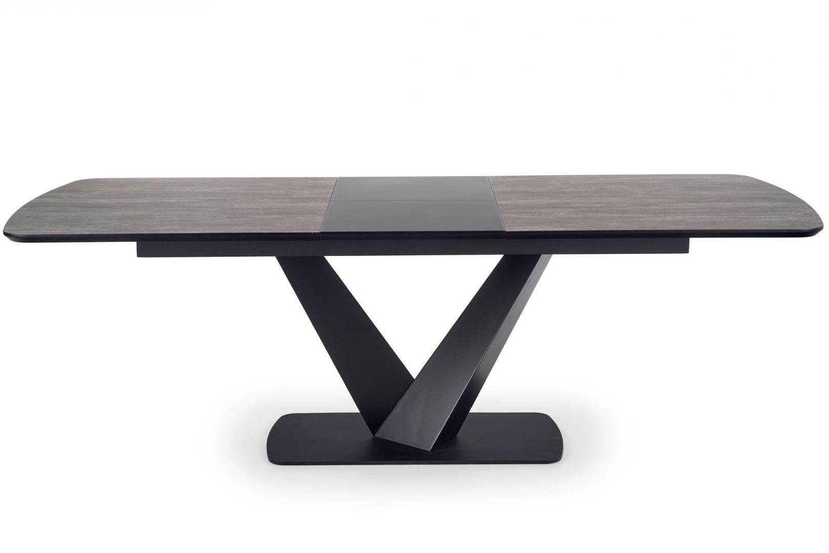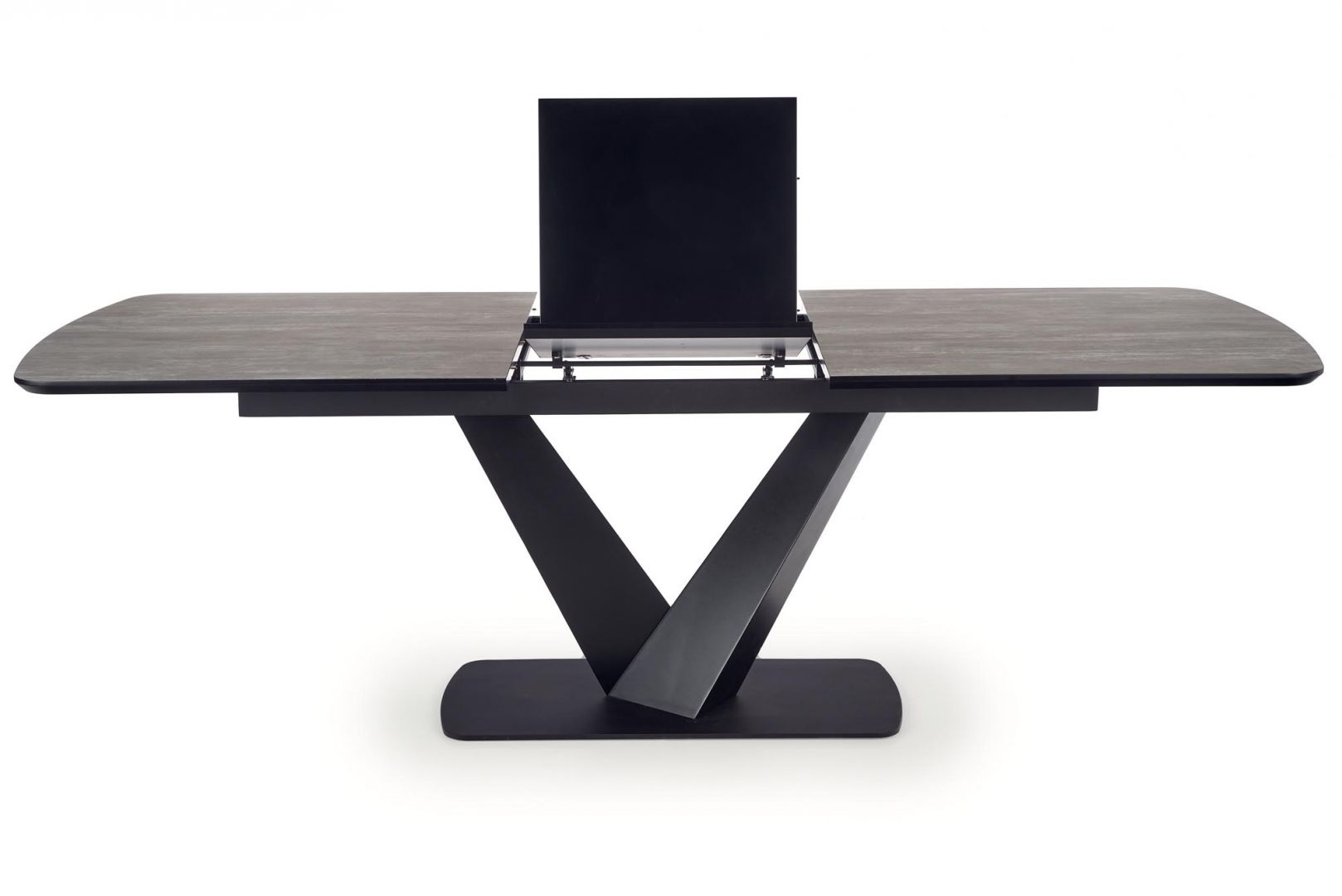 Jídelní rozkládací stůl VINSTON - je moderní jídelní stůl vyrobený z lakované MDF a HPL desky a designové podnože z černé lakované oceli. Stůl je vhodný do moderní jídelny.