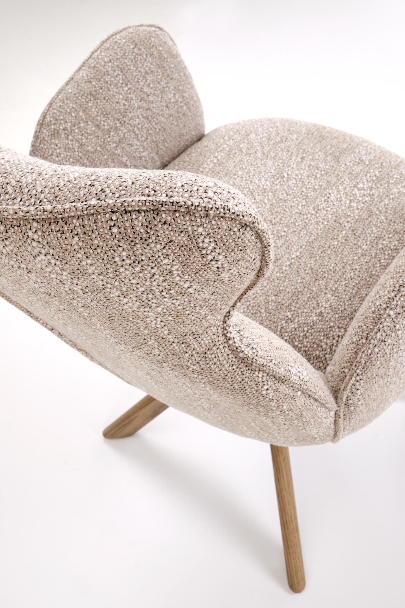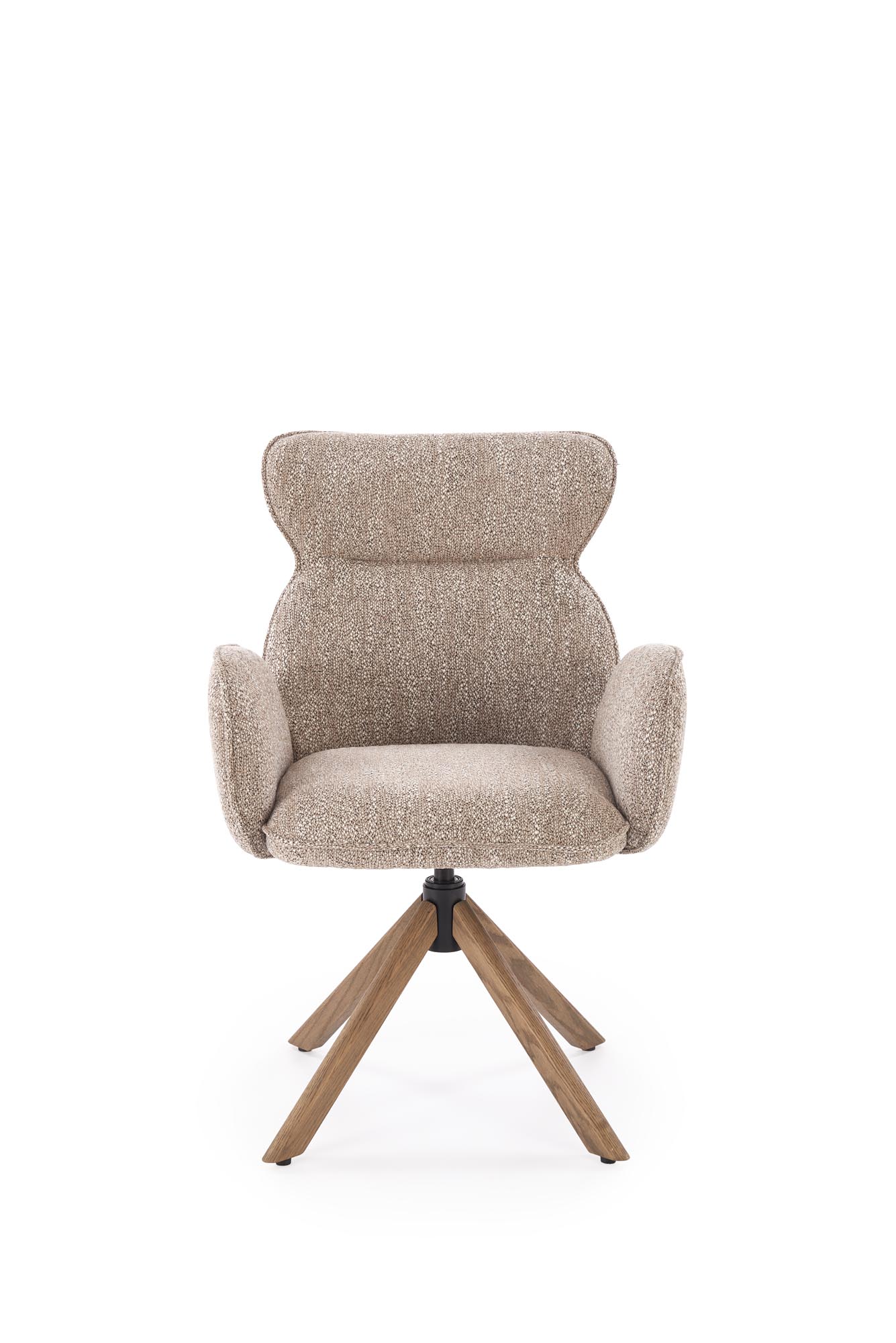 Jídelní židle K585 - je elegantní otočná židle vyrobena v kombinaci masivního dřeva, pohodlného tkaninového sedáku a opěradla čalouněné látkou v tmavě béžové barvě.