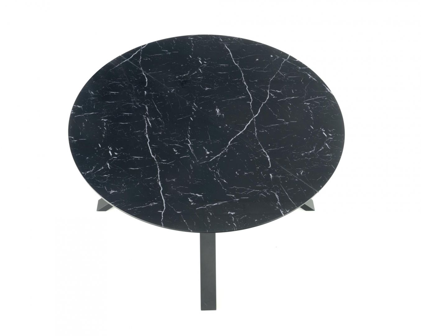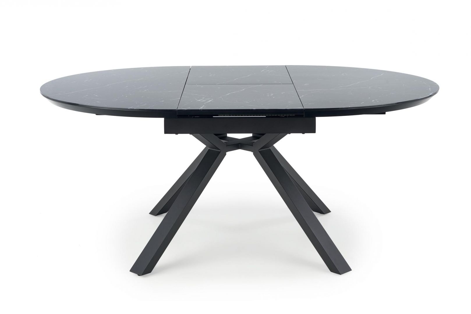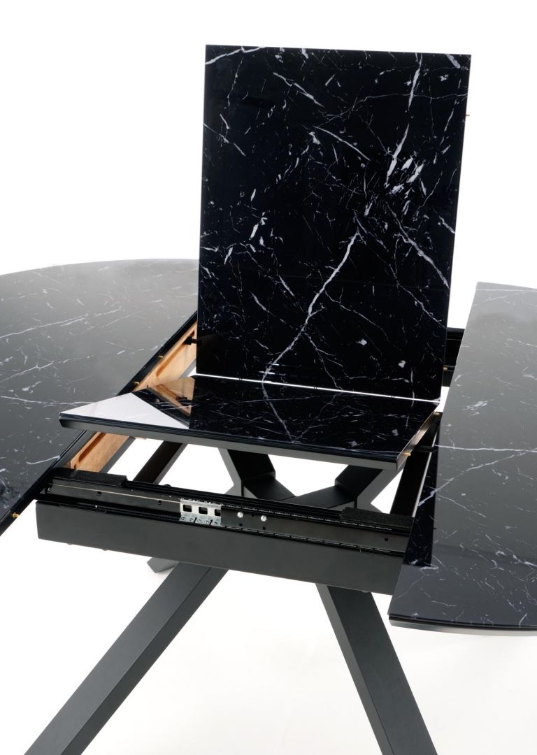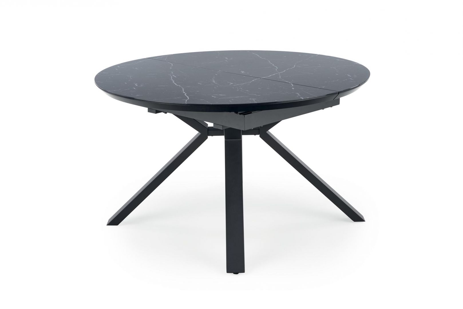 Jídelní stůl VERTIGO - je moderní rozkládací kulatý jídelní stůl vyrobený ze skleněné desky v barvě černého mramoru a designové podnože z černé lakované oceli. Stůl je vhodný do moderní jídelny.