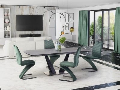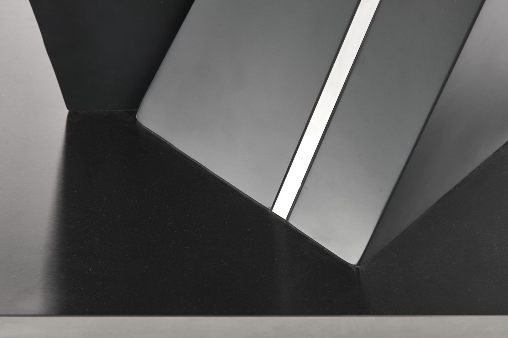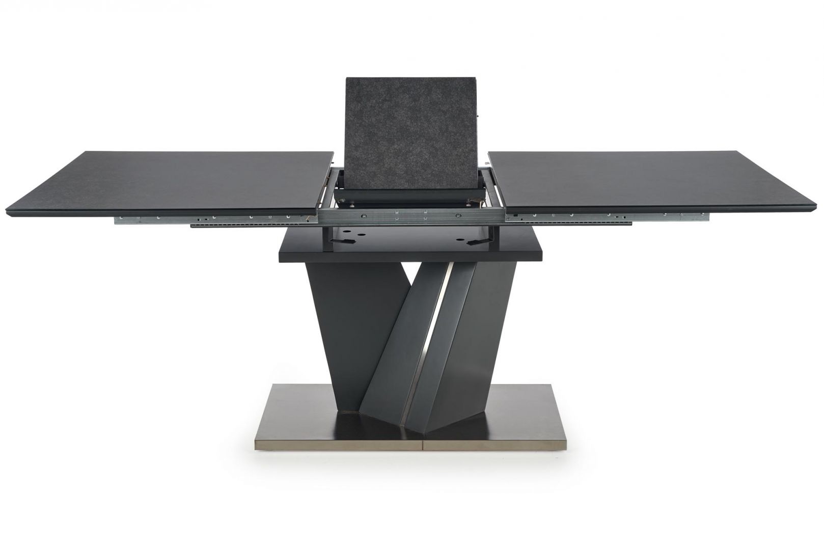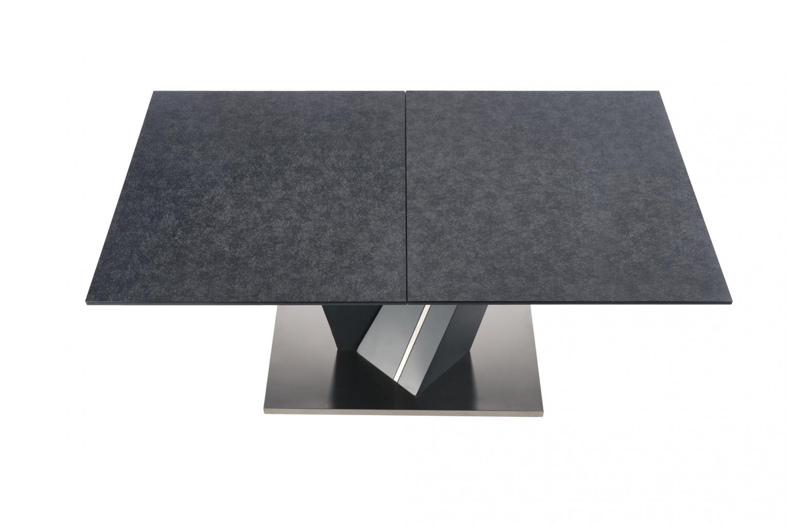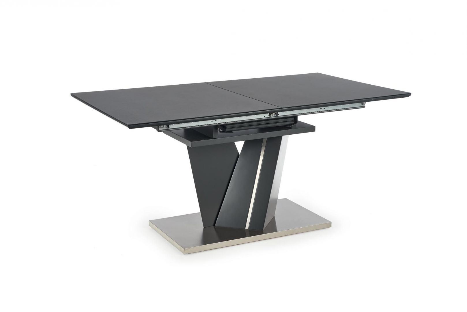 Jídelní rozkládací stůl SALVADOR - je moderní jídelní stůl vyrobený z lakované MDF desky, skla a designové podnože z tmavě šedé lakované oceli a nerezi. Stůl je rozkládací a je vhodný do moderní jídelny.