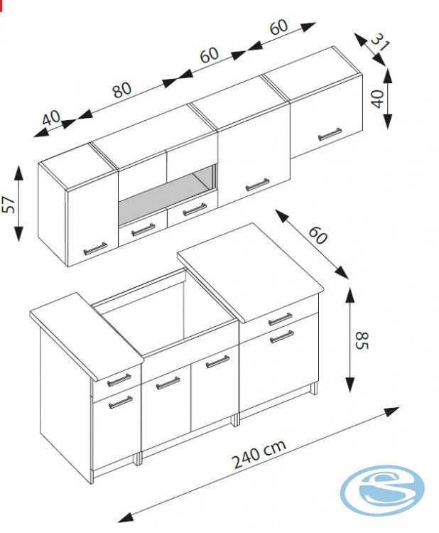 - spodní řada kuchyňské linky : 40 (1 dvířka +1 zásuvka) + 80 (dřezová 2 dvířka) + 60 ( 1 dvířková+1 zásuvka )