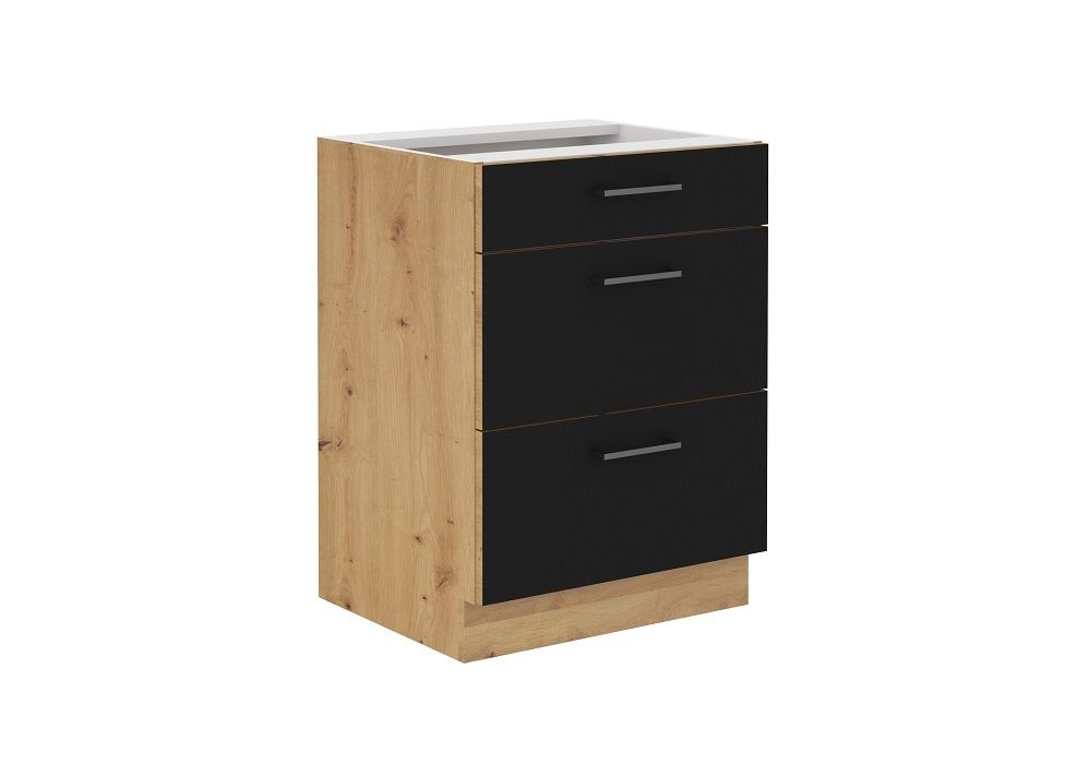 Spodní zásuvková skříňka ze systému MODERNA - skříňka do kuchyňské linky je opatřena třemi výsuvnými šuplíky se širokými plastovými úchyty. Dvířka skříněk jsou provedené v moderním černém matu a korpus je v dekoru dub Artisan.