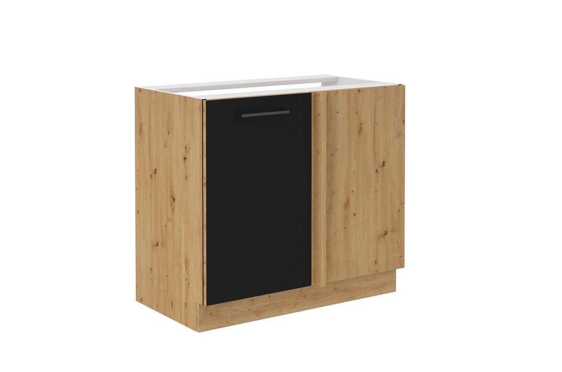 Spodní rohová skříňka ze systému MODERNA - rohová skříňka do kuchyňské linky je uzavíratelná praktickými dvířky se širokým plastovým úchytem. Dvířka skříněk jsou provedené v moderním černém matu v kombinaci s korpusem v dubu Artisan. Unverzální provedení levá / pravá.