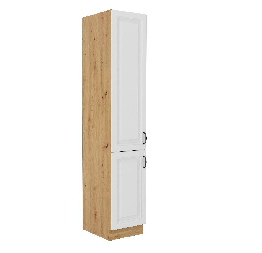 Vysoká potravinová skříň ze systému STILLO BÍLÁ / ARTISAN - skříňka do kuchyňské linky je opatřena dvěma prostory s policemi a otevíracími dvířky se širokými úchyty. Dvířka skříněk jsou vyrobeny v bílém matném provedení v kombinaci s korpusem v dubu Artisan. Systém tichého dovíraní dvířek.