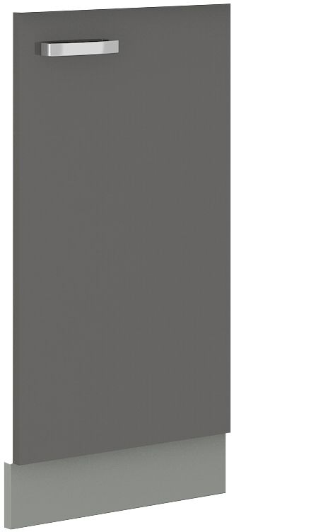 Dvířka na myčku ze systému GREI - dvířka na myčku s širokým úchytem. Dvířka skříněk jsou provedené v moderním šedého lesku a sokl v šedém matu.