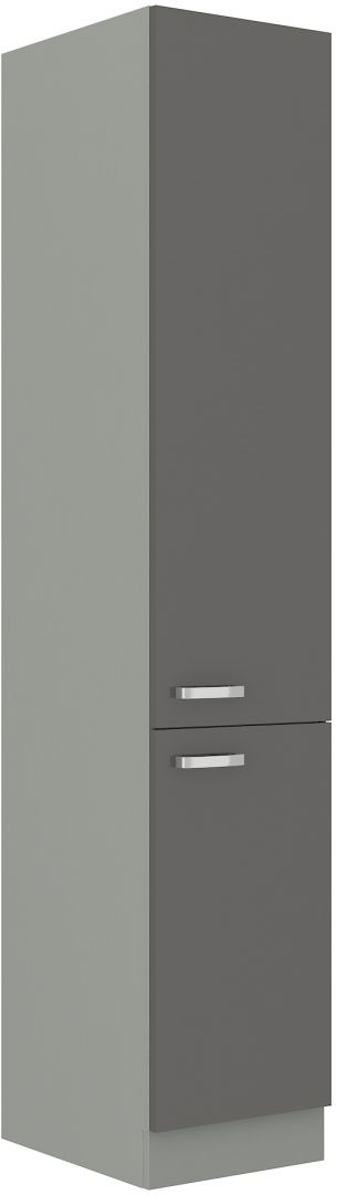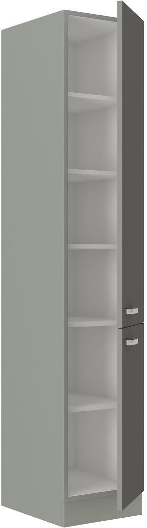 Vysoká potravinová skříň ze systému GREI - skříň do kuchyňské linky je uzavíratelná praktickými dvířky se širokými kovovými úchyty. Skříň je vhodná na uschování potravin apod. Dvířka skříněk jsou provedené v dekoru šedý lesk. Dvířka s tichým dorazem.