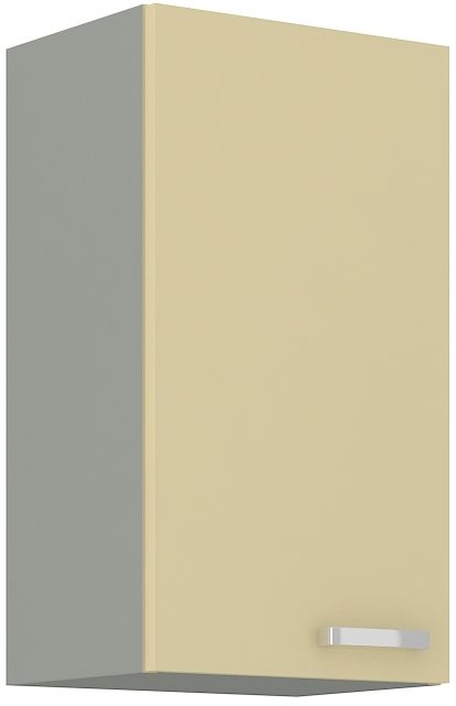 Horní otevírací plná skříňka ze systému CARMEN - skříňka do kuchyňské linky je uzavíratelná praktickými dvířky se širokým úchytem. Dvířka skříněk jsou provedené v moderním krémovém lesku. Dvířka skříňky mají tichý doraz.