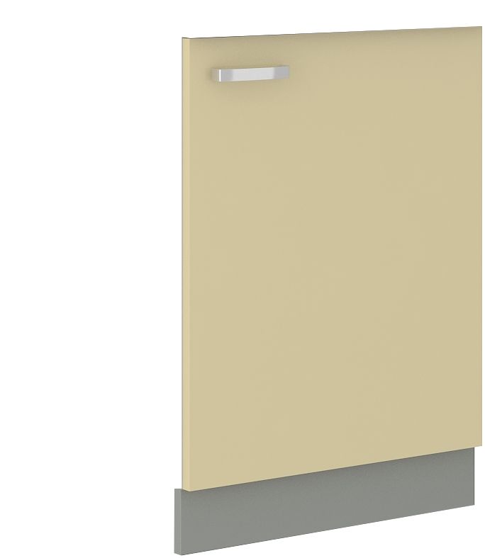 Dvířka na myčku ze systému CARMEN - dvířka na myčku v s širokým úchytem. Dvířka skříněk jsou provedené v moderním krémovém lesku a sokl v šedém matu.