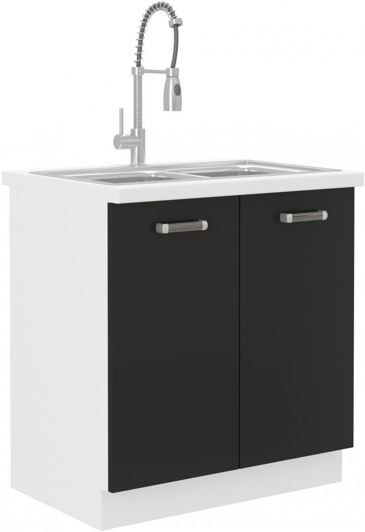 Spodní dřezová skříňka ze systému OMEGGA - dřezová skříňka do kuchyňské linky je uzavíratelná praktickými dvířky se širokými úchyty. Dvířka skříněk jsou provedené v moderní barevné kombinaci: dvířka černá a korpus bílý.