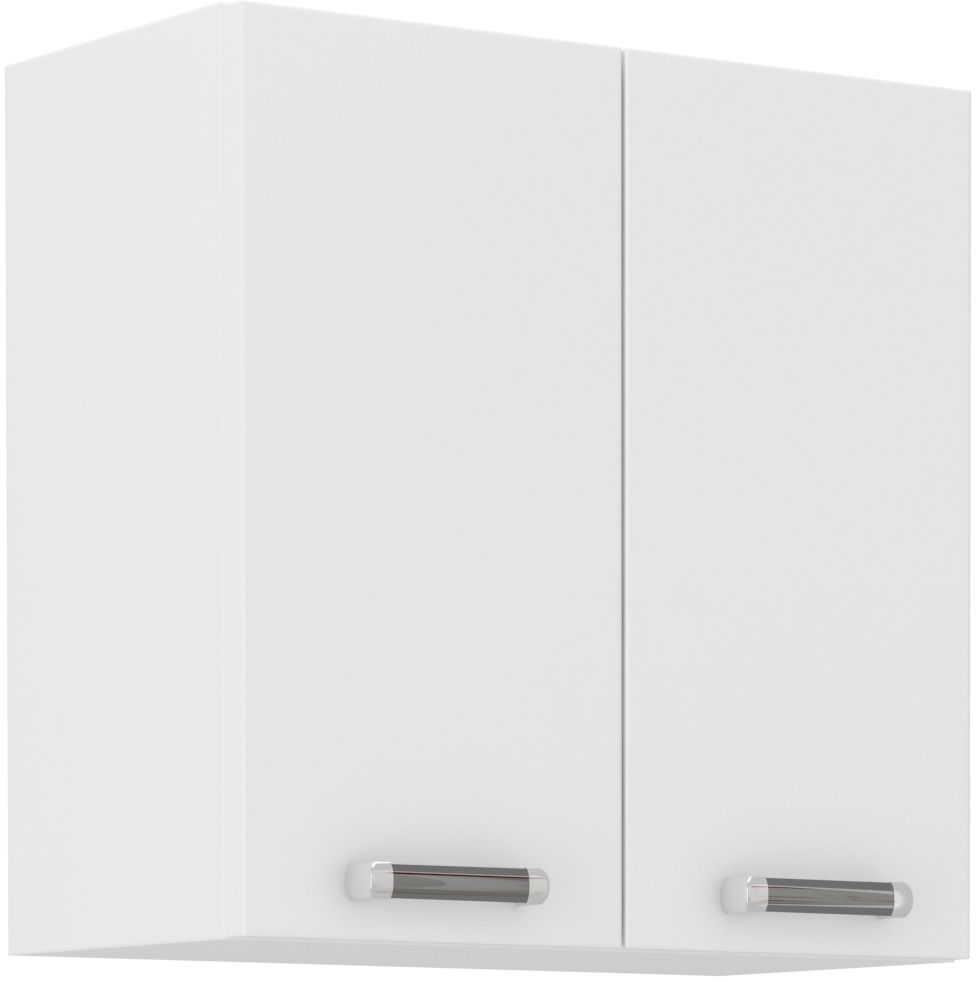 Horní skříňka ze systému OMEGGA - skříňka do kuchyňské linky je uzavíratelná praktickými dvířky se širokými úchyty. Dvířka a korpus skříněk jsou vyrobené v bílém barevném provedení.
