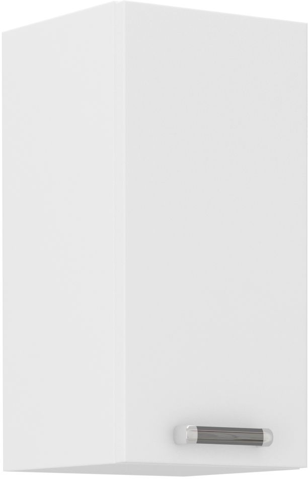 Horní skříňka ze systému OMEGGA - skříňka do kuchyňské linky je uzavíratelná praktickými dvířky se širokým úchytem. Dvířka a korpus skříněk jsou vyrobené v bílém barevném provedení.