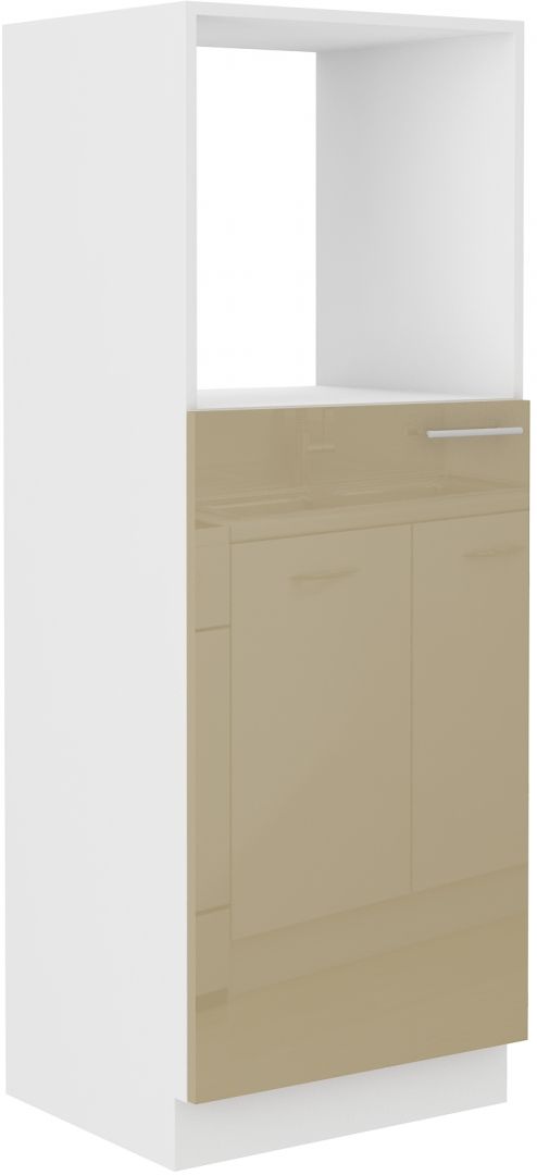 Skříň na vestavnou troubu ze systému LARA CAPPUCINO - skříň do kuchyňské linky je vybavena dvířky s širokými kovovými úchyty. Dvířka skříně jsou vyrobeny v cappucino lesklém provedení v kombinaci s bílým korpusem.