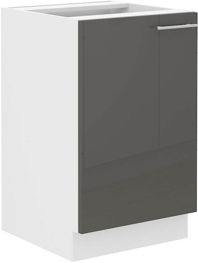 Spodní dřezová skříňka ze systému LARA GREY - skříňka do kuchyňské linky je vybavena dvířky s širokým kovovým úchytem. Dvířka skříněk jsou vyrobeny v šedém lesklém provedení v kombinaci s bílým korpusem.