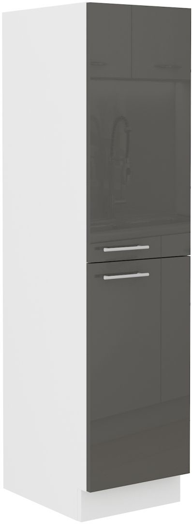 Skříň s výsuvným cargo košem ze systému LARA GREY - skříň do kuchyňské linky je vybavena dvířky s širokými kovovými úchyty. Dvířka skříně jsou vyrobeny v šedém lesklém provedení v kombinaci s bílým korpusem.