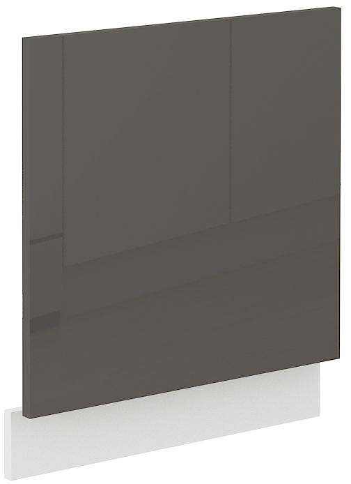 Dvířka na vestavnou myčku do kuchyně ze sektorového systému LARA GREY o rozměru 57 x 59,6 x 1,6 cm. Dvířka jsou vyrobena v kombinaci lakované MDF v šedé lesklé barvě a sokl je z bílého lamina.