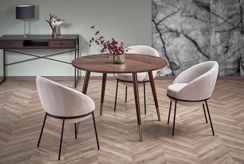 Jídelní stůl DOMENICO - je moderní kulatý jídelní stůl vyroben v kombinaci dýhované desky v barvě ořechu a lakované ocelové podnože.