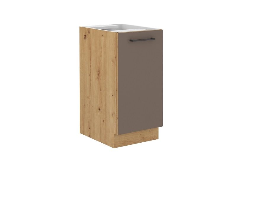 Spodní otevírací skříňka ze systému BOLOGNA - skříňka do kuchyňské linky je uzavíratelná praktickými dvířky se širokým plastovým úchytem v černé barvě o délce 136 mm. Dvířka skříněk jsou provedené v moderním lanýžově šedém matu a korpus v dekoru dub Artisan.