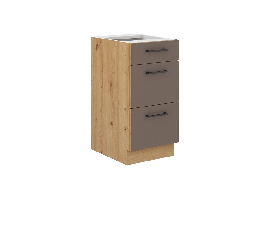 Spodní zásuvková skříňka ze systému BOLOGNA - skříňka do kuchyňské linky je opatřena třemi výsuvnými šuplíky se širokými plastovými úchyty v černé barvě o délce 136 mm. Dvířka skříněk jsou provedené v moderním lanýžově šedém matu a korpus je v dekoru dub Artisan.