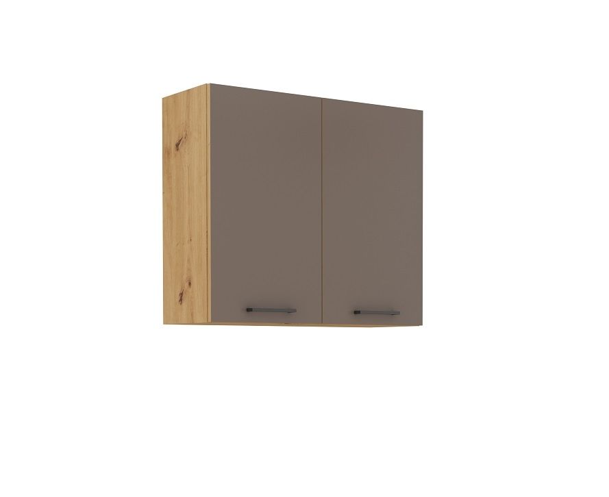 Horní otevírací skříňka ze systému BOLOGNA - skříňka do kuchyňské linky je uzavíratelná praktickými dvířky se širokým plastovým úchytem o délce 136 mm. Korpus je dekoru dub artisan a dvířka skřínky jsou vyrobeny v barvě lanýžově šedý mat.