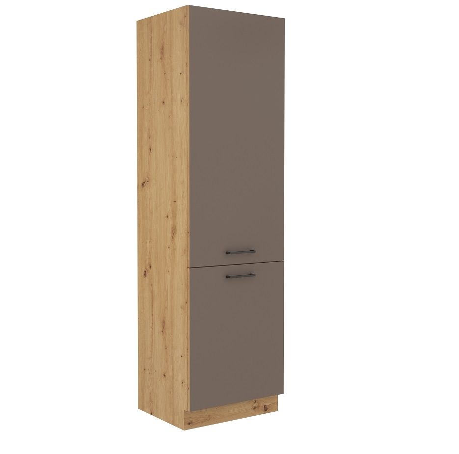 Vysoká potravinová skříň ze systému BOLOGNA - skříň do kuchyňské linky je uzavíratelná praktickými dvířky se širokými plastovými úchyty o délce 136 mm. Skříň je vhodná na uschování potravin apod. Dvířka skříněk jsou provedené v barvě lanýžově šedého matu a korpusy v dekoru dub Artisan.