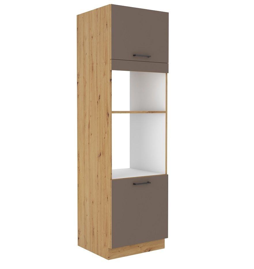 Vysoká skříň na vestavnou troubu a mikrovlnku ze systému BOLOGNA - skříň do kuchyňské linky je uzavíratelná praktickými dvířky se širokými plastovými úchyty o délce 136 mm. Dvířka skříněk jsou provedené v barvě lanýžově šedém matu a korpusy v dekoru dub Artisan.
