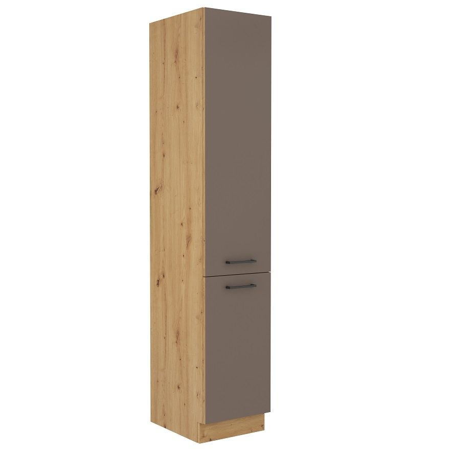 Vysoká potravinová skříň ze systému BOLOGNA - skříň do kuchyňské linky je uzavíratelná praktickými dvířky se širokými plastovými úchyty o délce 136 mm. Skříň je vhodná na uschování potravin apod. Dvířka skříněk jsou provedené v barvě lanýžově šedém matu a korpusy v dekoru dub Artisan.