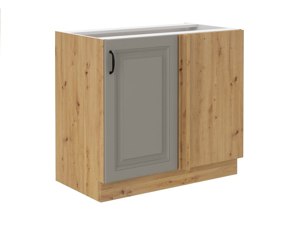 Spodní rohová skříňka ze systému STILLO SVĚTLE ŠEDÁ / ARTISAN - rohová skříňka do kuchyňské linky je uzavíratelná praktickými dvířky se širokým kovovým úchytem. Dvířka skříněk jsou vyrobeny ve světle šedém matném provedení v kombinaci s korpusem v dubu Artisan. Skříňka je univerzální (levá/pravá)