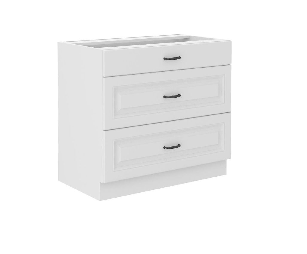 Spodní zásuvková skříňka ze systému STILLO BÍLÁ - skříňka do kuchyňské linky je opatřena třemi výsuvnými šuplíky se širokými úchyty. Dvířka skříněk jsou vyrobeny z MDF v bílém matném provedení v kombinaci s bílým korpusem.