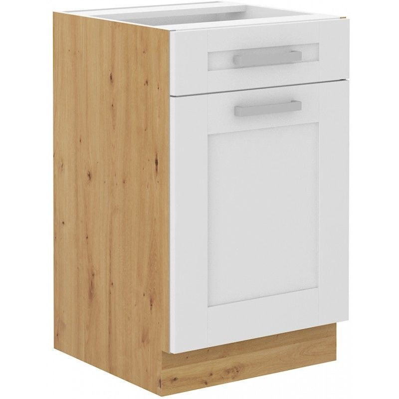 Spodní otevírací skříňka se šuplíkem ze systému LUNNA BÍLÁ / ARTISAN - skříňka do kuchyňské linky je uzavíratelná praktickými dvířky a výsuvným šuplíkem se širokým kovovým úchytem.Dvířka skříněk jsou vyrobeny v bílém matném provedení v kombinaci s korpusem v dubu Artisan.