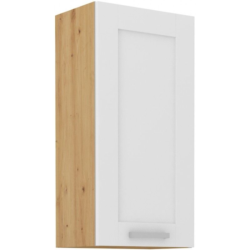 Horní otevírací skříňka ze systému LUNNA BÍLÁ / ARTISAN - skříňka do kuchyňské linky je uzavíratelná praktickými dvířky se širokými kovovými úchyty. Dvířka skříněk jsou vyrobeny v bílém matném provedení v kombinaci s korpusem v dubu Artisan.