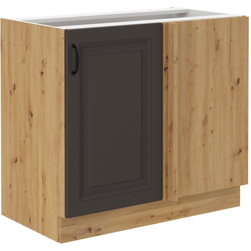Spodní rohová skříňka ze systému STILLO GRAPHITE / ARTISAN- rohová skříňka do kuchyňské linky je uzavíratelná praktickými dvířky se širokým kovovým úchytem. Dvířka skříněk jsou vyrobeny v tmavém matném provedení v kombinaci s korpusem v dubu Artisan. Skříňka je univerzální (levá/pravá)