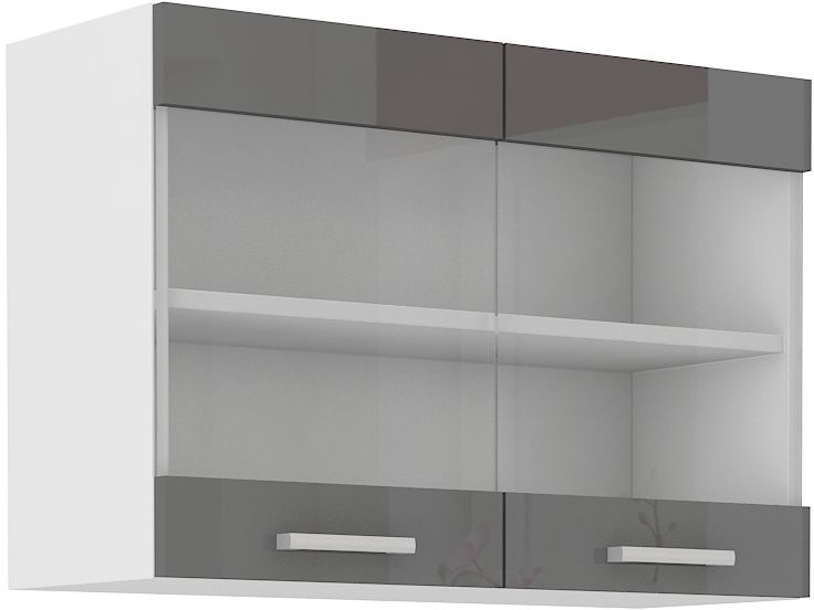 Horní prosklená otevírací skříňka ze systému SONA - skříňka do kuchyňské linky je uzavíratelná praktickými dvířky se širokými úchyty. Dvířka skříněk jsou provedené v moderním šedém lesku.
