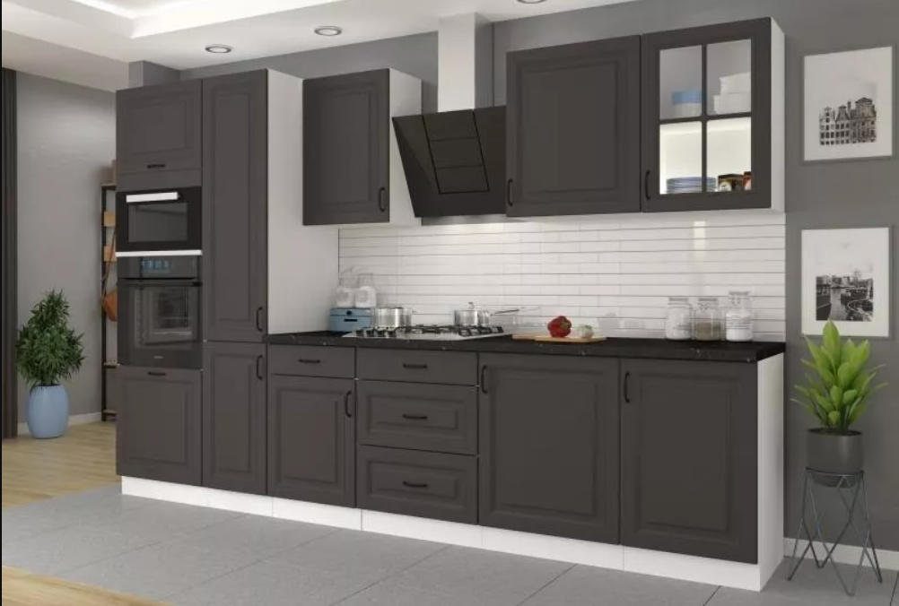 Kuchyňská linka ze systému STILLO GRAPHITE / BÍLÁ - dvířka skříněk jsou vyrobeny z MDF ve grafitovém matném provedení v kombinaci s bílým korpusem. Systém tichého dovíraní dvířek a zásuvek. Z modelové řady STILLO GRAPHITE bílá lze sestavit kuchyňskou linku na míru vašemu interiéru.