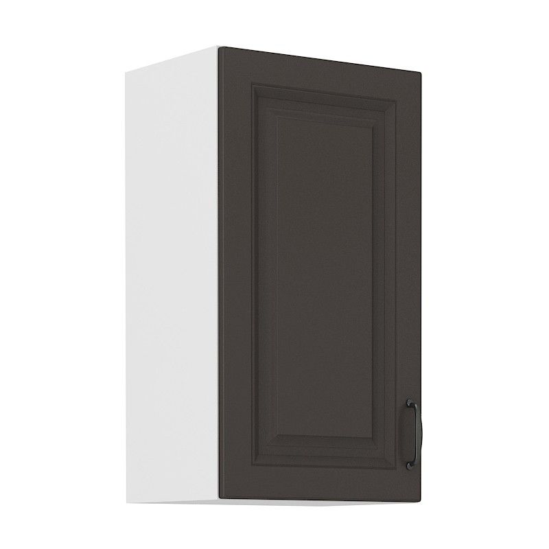Horní otevírací skříňka ze systému STILLO GRAPHITE / BÍLÁ - skříňka do kuchyňské linky je uzavíratelná praktickými dvířky se širokým kovovým úchytem. Dvířka skříněk jsou vyrobeny v tmavém matném provedení v kombinaci s bílým korpusem.