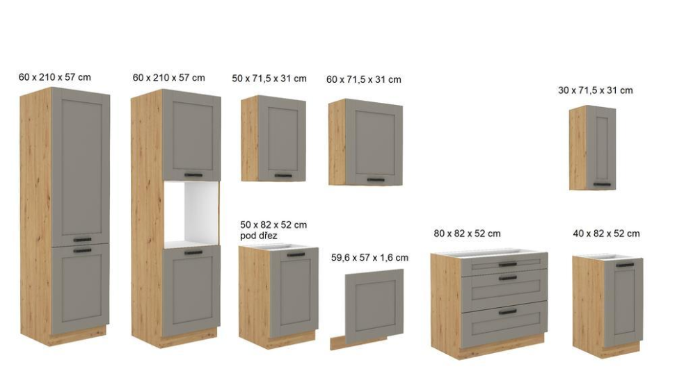 Skříňky do kuchyně ze sektorového systému LUNNA SVĚTLE ŠEDÁ / ARTISAN lze vybírat z různých variant výšek a šířek. Skříňky jsou opatřeny kvalitními šuplíky s tichým dojezdem. Praktické kuchyňské skříňky jsou vhodné do každé kuchyně a dokonale využijí každý část prostoru. Kuchyňské skříňky pro kuchyňskou linku bychom mohli rozdělit na tři základní typy skříněk: spodní kuchyňské skříňky, horní kuchyňské skříňky a rohové kuchyňské skříňky. Správnou kombinací těchto typů skříněk si dokážete vytvořit kuchyň podle vašich představ. Kuchyňská linka je dodávána bez pracovní desky a bez spotřebičů.