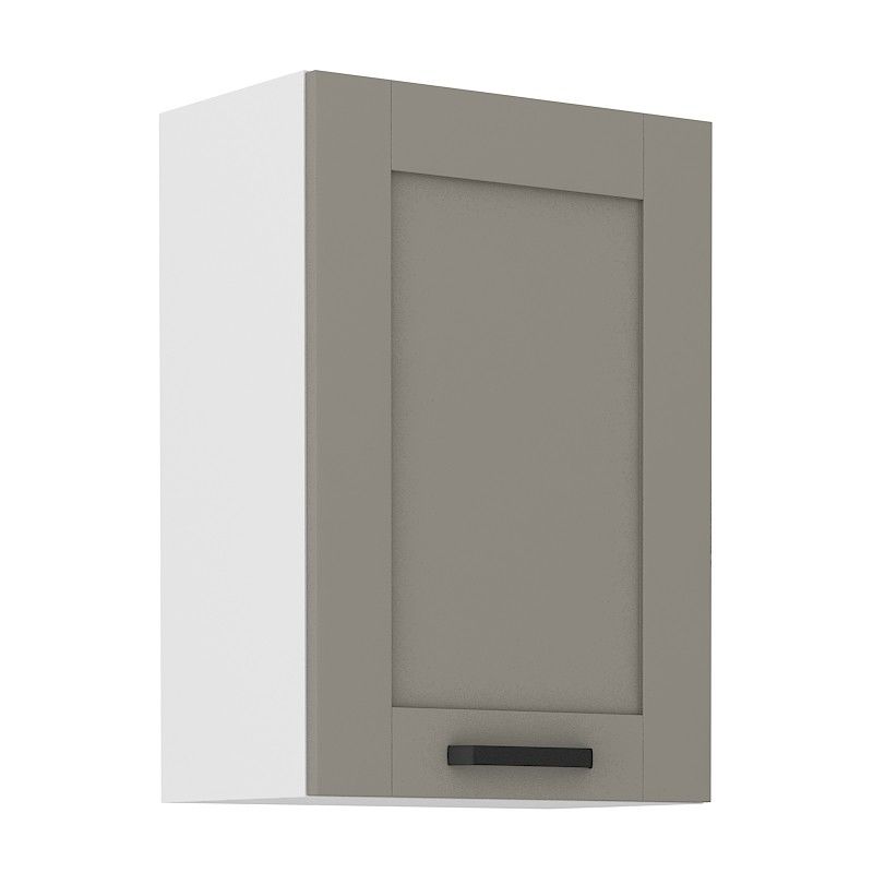 Horní otevírací skříňka ze systému LUNNA SVĚTLE ŠEDÁ / BÍLÁ - skříňka do kuchyňské linky je uzavíratelná praktickými dvířky se širokým kovovým úchytem. Dvířka skříněk jsou vyrobeny ve světle šedém matném provedení v kombinaci s bílým korpusem.