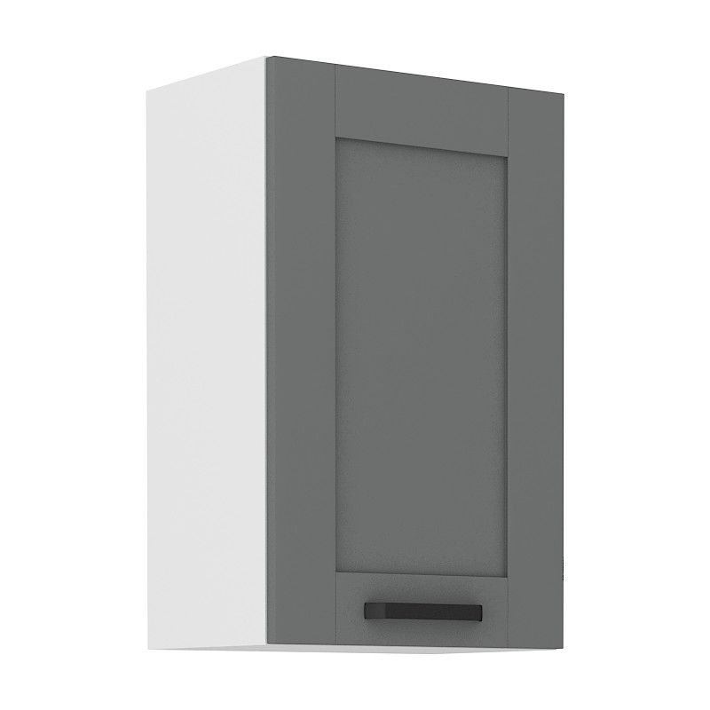 Horní otevírací skříňka ze systému LUNNA TMAVĚ ŠEDÁ / BÍLÁ - skříňka do kuchyňské linky je uzavíratelná praktickými dvířky se širokým kovovým úchytem. Dvířka skříněk jsou vyrobeny ve tmavě šedém matném provedení v kombinaci s bílým korpusem.