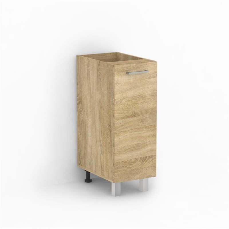 Spodní kuchyňské skříňky jsou na nožkách, vpředu jsou elegantní kovové nožičky a v zadní části jsou nastavitelné nohy z černého plastu. Kuchyňská skříňka je vyrobena z kvalitní laminované DTD desky. Spodní skříňka do kuchyně je uzavíratelná praktickými dvířky se širokými kovovými úchyty v levé horní části dvířek. Dvířka skříněk jsou univerzální tj. levá i pravá.