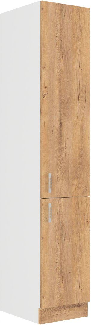 Vysoká potravinová skříň ze systému SARA LEFKASS - skříň do kuchyňské linky je uzavíratelná praktickými dvířky se širokými úchyty. Skříň je vhodná na uschování potravin apod. Dvířka skříněk jsou provedené v moderním dekoru dub lefkas.