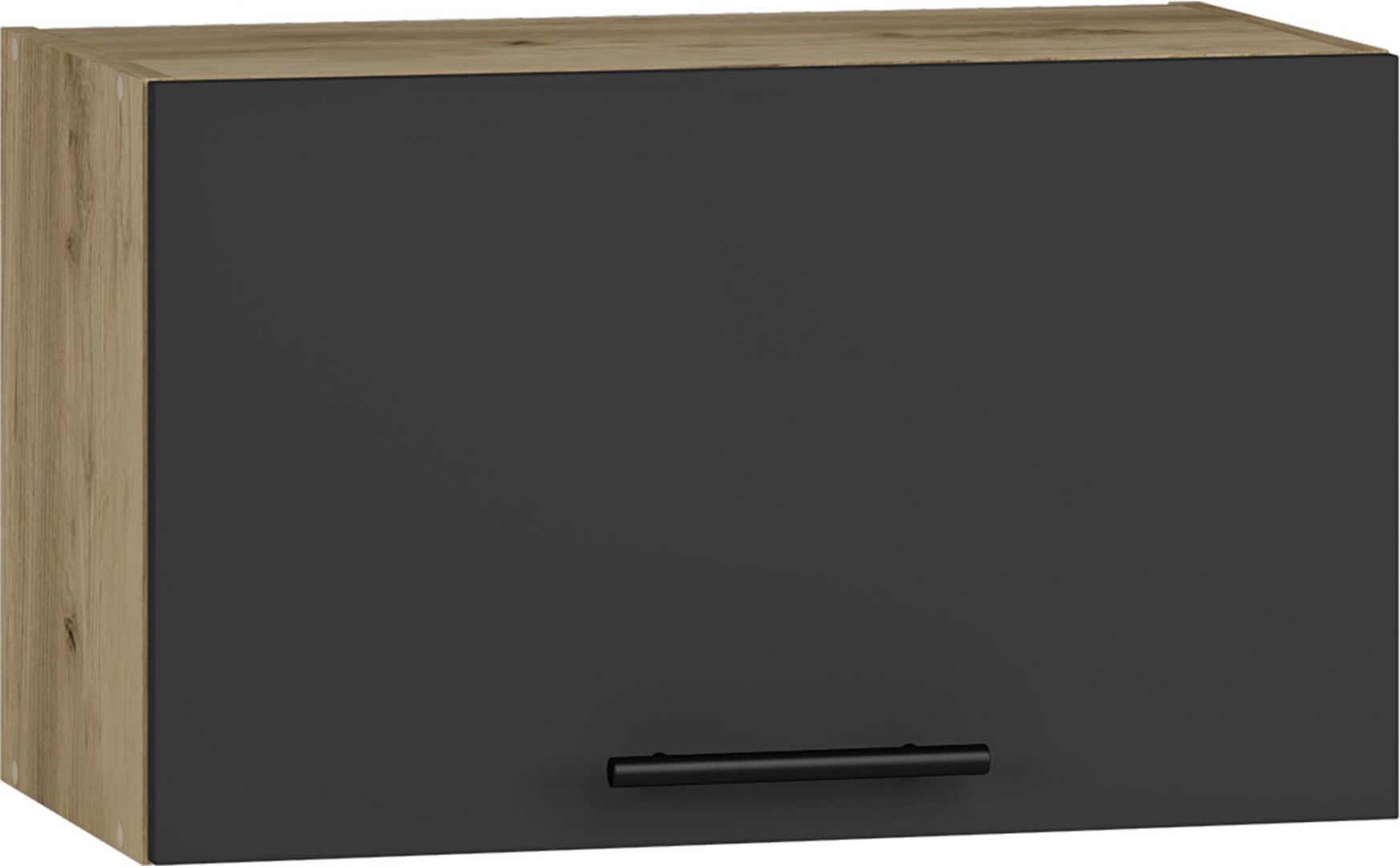 Vrchní nízká otevírací skříňka ze systému VENTO - skříňka do kuchyňské linky je uzavíratelná praktickými dvířky s širokým kovovým úchytem. Dvířka skříně jsou provedené v moderní antracytové barvě v kombinaci s korupusem v dubu kraft.